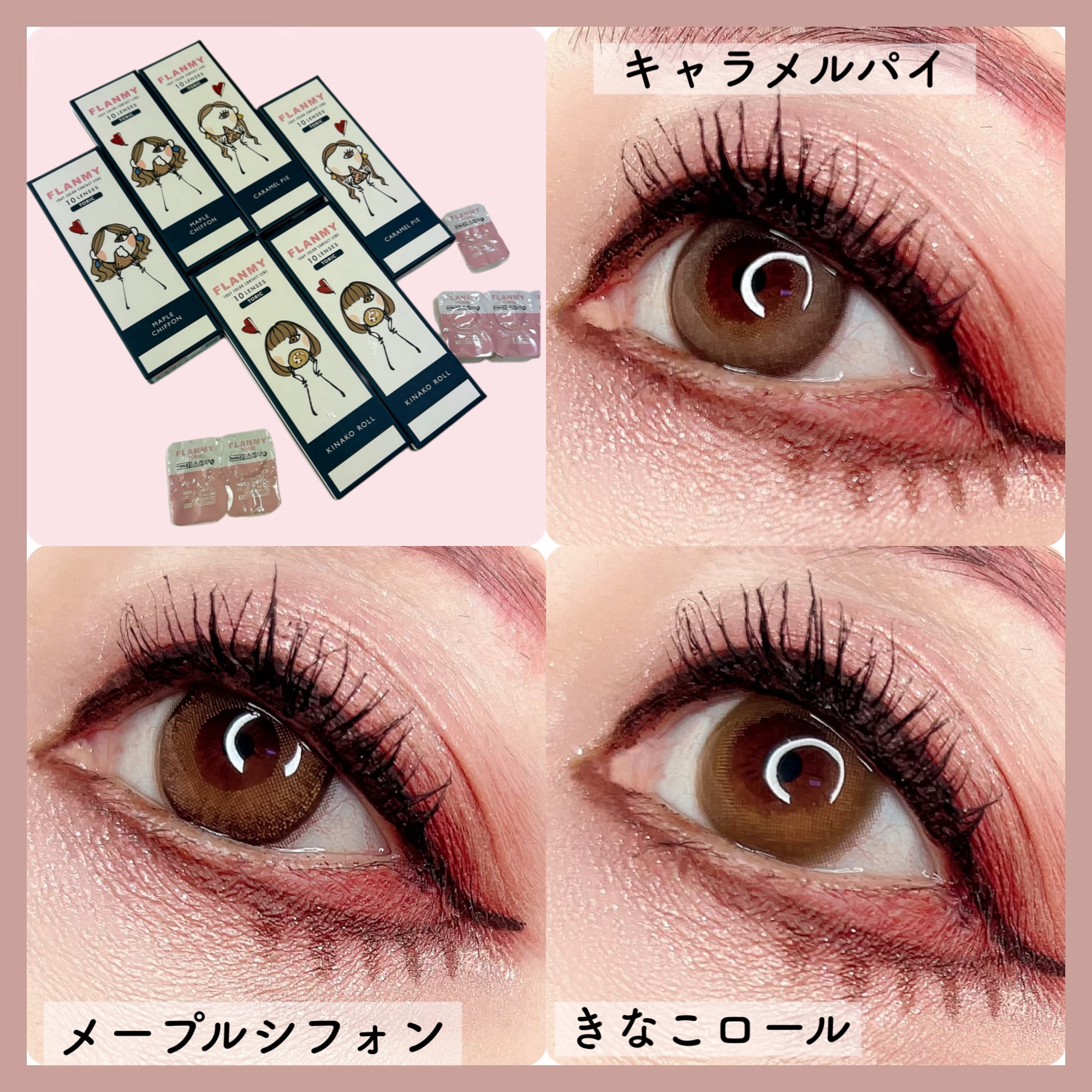 FLANMY TORICの新しい3色に乱視用カラコンが出たよ🥺 発色も綺麗すぎるし可愛い🤍 まさに垢抜けカラコンすぎる🫶🏻 派手なカラーじゃないから馴染みやすいし 乱視用ってのが本間に好きなカラーデザインで出てることってないから嬉しい🕯️🤍