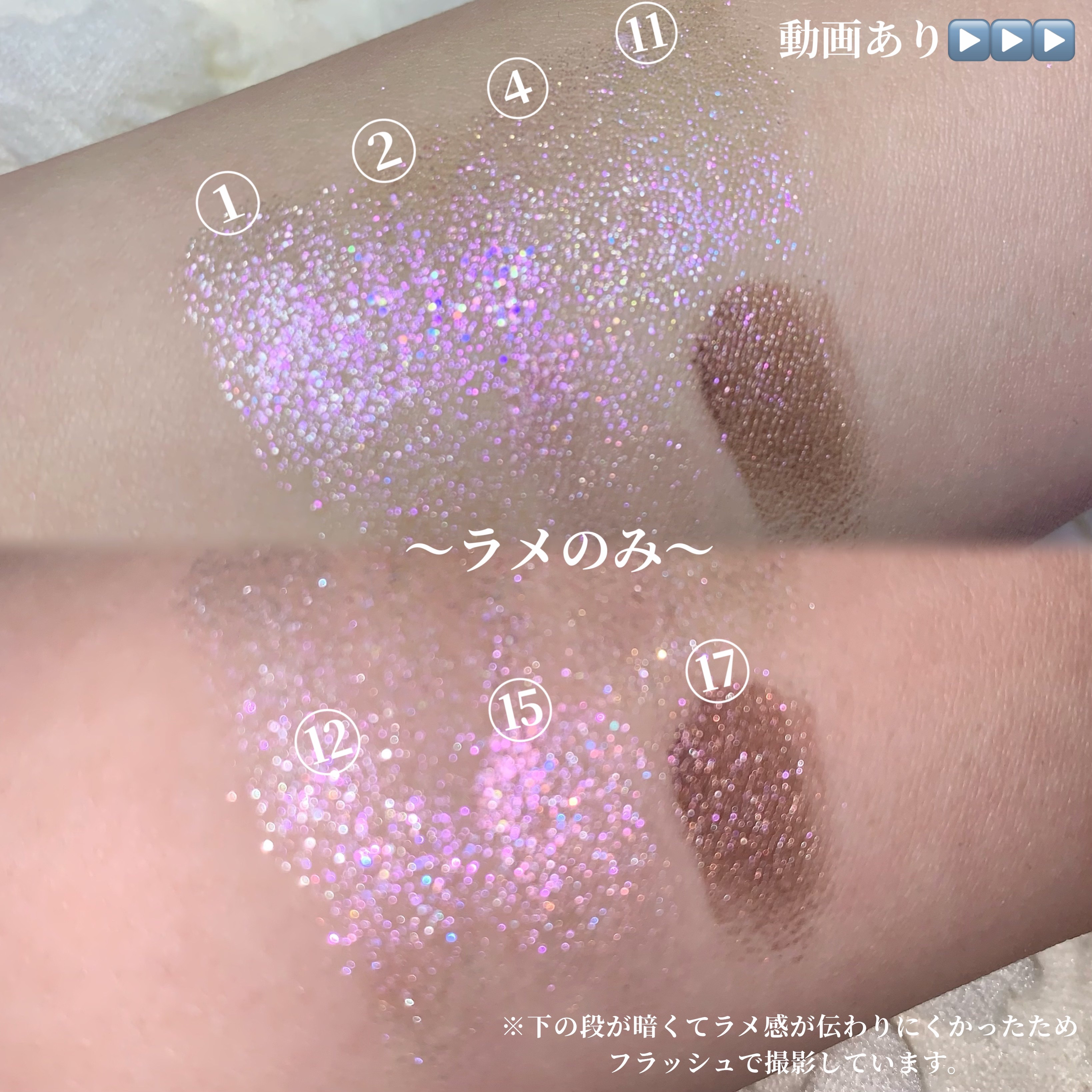 とにかく可愛い!ブルベ色、青みピンクが好きな方は絶対買ってみて欲しいです😭💗 発色、ラメ感が見たまま ラメの質感が天才的でラメ飛びしづらい 色々なバリエーションのアイメイクができる