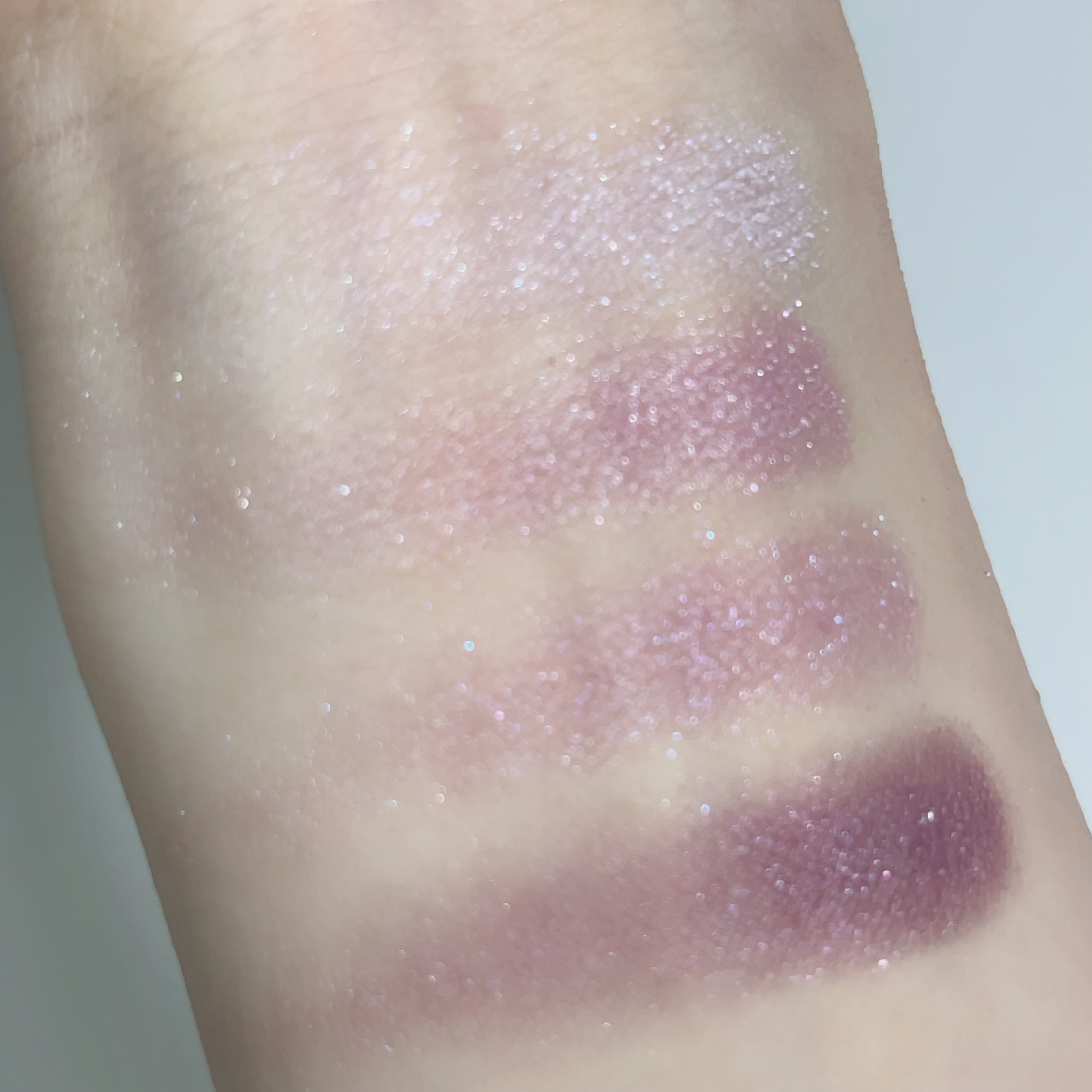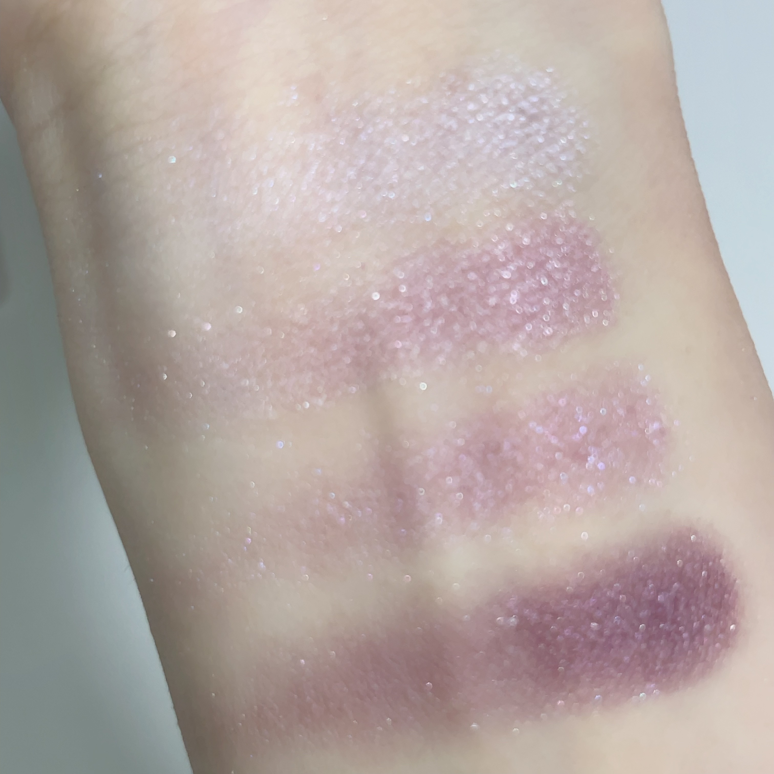 キャンメイクシルキースフレアイズ12モーニングビオラ儚くも美しい印象のピンクパープル右上ピンクパープル偏光ブルーラメ右下パープルブラウンシルバー・ブルーラメ左下モーヴカラーパープル・ブルーラメ左上白みパープル偏光ブルーラメ全てラメ入りの青みカ...