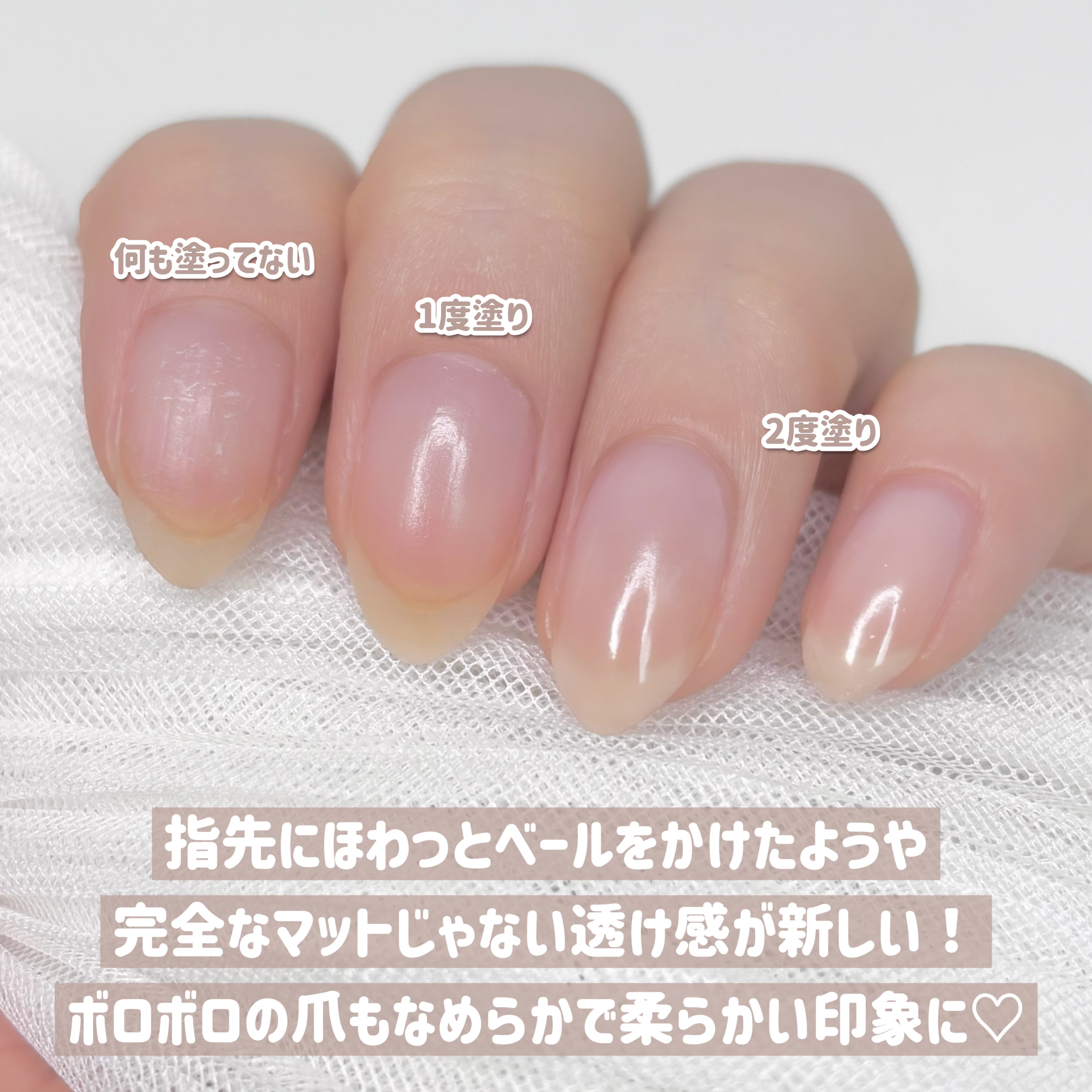 - "モチの良さ"にこだわった処方で、ベースコート無しでもしっかりと爪に密着し、 塗りたての美しさが長く続きます。なめらかな塗り心地で、ムラなく美しく塗れるテクスチャ。