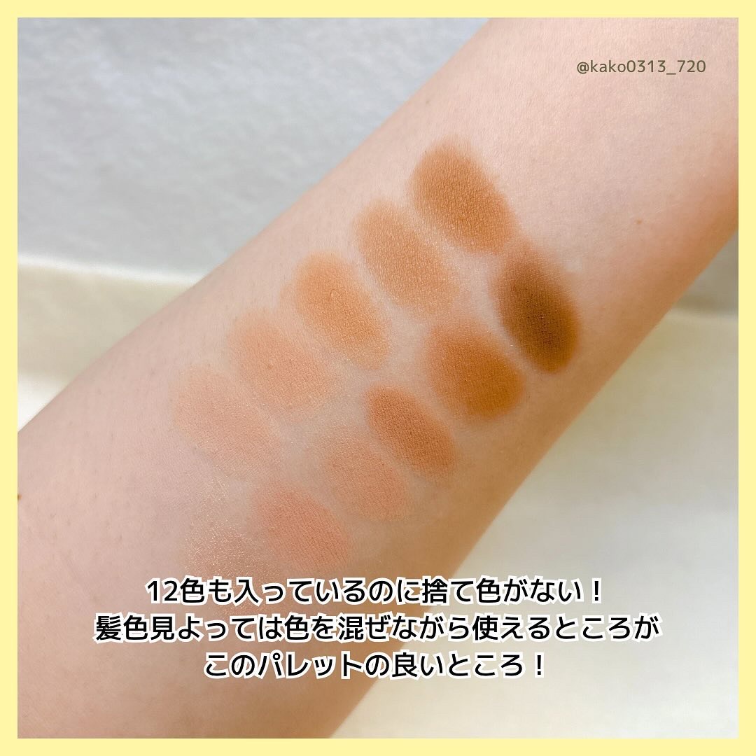 全体的にベージュがかったアイシャドウで、発色がすごい濃いっていうわけでなく、ふんわりした発色なのでナチュラルメイクや強調しすぎないなメイクにしたいって言う人はコレすごいおすすめ! ただ締め色がないから詐欺メイクしたい人は向いてないかも💦 色は全て可愛くて、薄めの色だから似合う似合わない関係なく使えるのもあるから普段メイクにも使えますね❣️