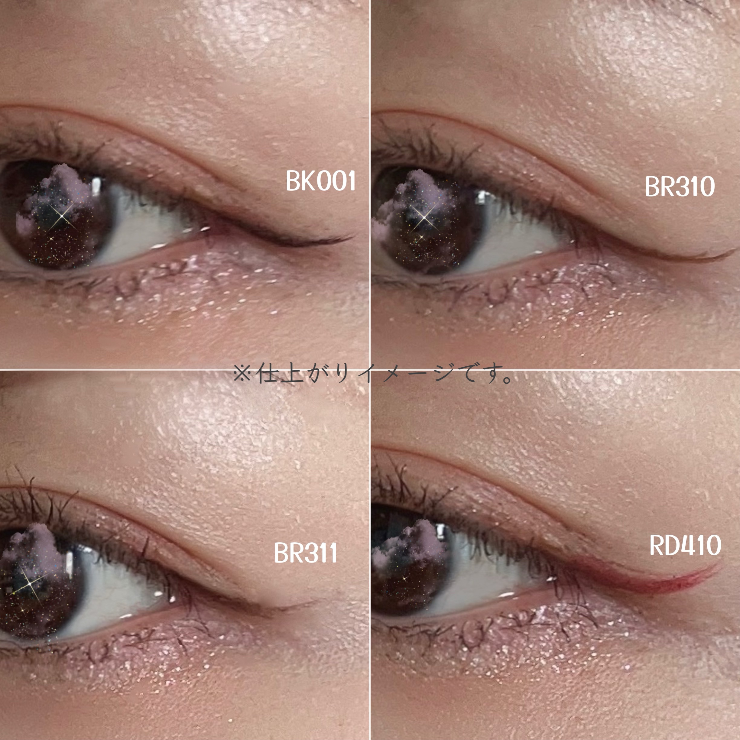 - <BK001 ブラック> 水、アクリレーツコポリマーアンモニウム、BG、1,2-ヘキサンジオール、トコフェロール、水溶性コラーゲン、AMP、カプリリルグリコール、キサンタンガム、クエン酸、グリセリン、ジイソステアリン酸ポリグリセリル-2、ステアリン酸ポリグリセリル-10、セスキイソステアリン酸ソルビタン、トリイソステアリン酸ポリグリセリル-2、ベヘネス-30、ベントナイト、ポリグリセリル-3ジシロキサンジメチコン、ミリスチン酸ポリグリセリル-10、エチルパラベン、フェノキシエタノール、メチルパラベン、カーボンブラック <BR310 ブラウン> 水、アクリレーツコポリマーアンモニウム、BG、1,2-ヘキサンジオール、トコフェロール、水溶性コラーゲン、AMP、(チタン/酸化チタン)焼結物、カプリリルグリコール、キサンタンガム、クエン酸、グリセリン、ジイソステアリン酸ポリグリセリル-2、ステアリン酸ポリグリセリル-10、セスキイソステアリン酸ソルビタン、トリイソステアリン酸ポリグリセリル-2、ベヘネス-30、ベントナイト、ポリグリセリル-3ジシロキサンジメチコン、ミリスチン酸ポリグリセリル-10、エチルパラベン、フェノキシエタノール、メチルパラベン、カーボンブラック、酸化鉄 <BR311 ブラウンブラック> 水、アクリレーツコポリマーアンモニウム、BG、1,2-ヘキサンジオール、トコフェロール、水溶性コラーゲン、AMP、(チタン/酸化チタン)焼結物、カプリリルグリコール、キサンタンガム、クエン酸、グリセリン、ジイソステアリン酸ポリグリセリル-2、ステアリン酸ポリグリセリル-10、セスキイソステアリン酸ソルビタン、トリイソステアリン酸ポリグリセリル-2、ベヘネス-30、ベントナイト、ポリグリセリル-3ジシロキサンジメチコン、ミリスチン酸ポリグリセリル-10、エチルパラベン、フェノキシエタノール、メチルパラベン、カーボンブラック、酸化鉄、赤226 <RD410 バーガンディ> 水、アクリレーツコポリマーアンモニウム、BG、1,2-ヘキサンジオール、トコフェロール、水溶性コラーゲン、AMP、カプリリルグリコール、キサンタンガム、クエン酸、グリセリン、ジイソステアリン酸ポリグリセリル-2、ステアリン酸ポリグリセリル-10、セスキイソステアリン酸ソルビタン、トリイソステアリン酸ポリグリセリル-2、ベヘネス-30、ベントナイト、ポリグリセリル-3ジシロキサンジメチコン、ミリスチン酸ポリグリセリル-10、エチルパラベン、フェノキシエタノール、メチルパラベン、カーボンブラック、赤226