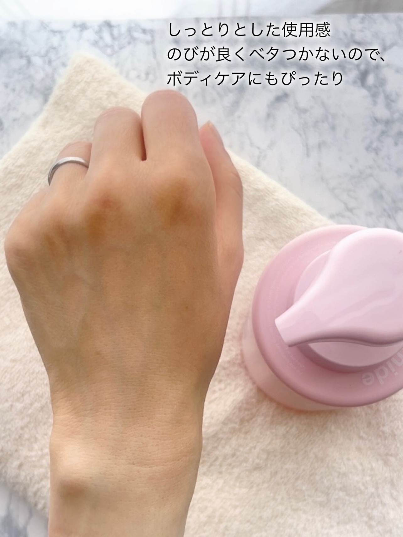 タオルドライ後、500円玉大を髪の根本から毛先へ、ミディアムなので2回(500円玉2個分)なじませています サラサラの水のようなテクスチャーで、濡れた髪にもスーッとなじむので使いやすい オイルのようにベタついたり、ヌルヌルしたりしないので、根本からかきあげながら指を通して毛先にもみこむように使っても全然イヤじゃない オイルなどだと基本毛先から中間までしかなじませられないけれど、これは根本からつけられて、地肌もべたつくこともないから使いやすい 乾かしたあとの髪はサラサラ 乾くまでの時間も少し早いのかもしれない ただ初めて使ったときは香りの強さにビックリしました 私の場合1回目では良さがわからず、使い続けていくうちに髪がサラサラ+ストンとまとまって、良さを実感する事ができました 今ではドライヤーで乾かしたあとの仕上がり、髪がベタつかない使用感などが気に入り、アウトバストリートメントのスタメン入りとなりました
