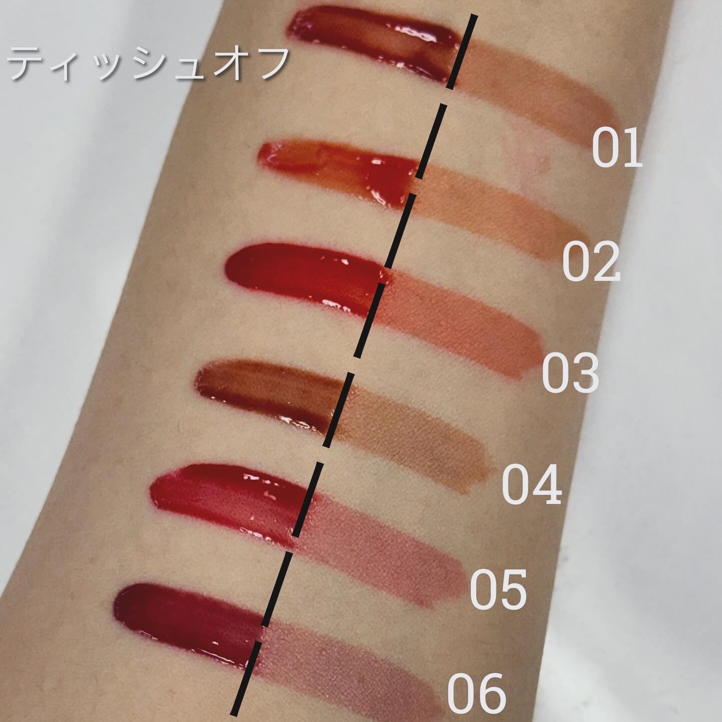 唇の軽く染み込んで、長時間クリアなキープ🙆🏻♀️ 色移りがしにくく、塗ったままのナチュラルなツヤ着色✨ 高い水分量と保湿成分配合で、しっとり保湿感を維持🫧 何度塗り重ねても濃くなりすぎず、クリアな血色感がある🥰 ツヤ系の嫌なべたつきが少なく、ティッシュオフするとより落ちにくい!! アプリケーターの中心に穴が空いた形で、液の付きすぎを防いでくれる🌹 唇の潤いも色持ちも良いので、長時間付けたての色がそのまま持続🌟 血色感と程よいツヤ感があり、ナチュラルメイクもすっぴんでも浮かない仕上がり🌈 パッケージも透明なキャップと、マットな本体がかわいい💖 落ちてきても汚さや乾燥がなく使用でき、新しい色味にも挑戦しやすい!!