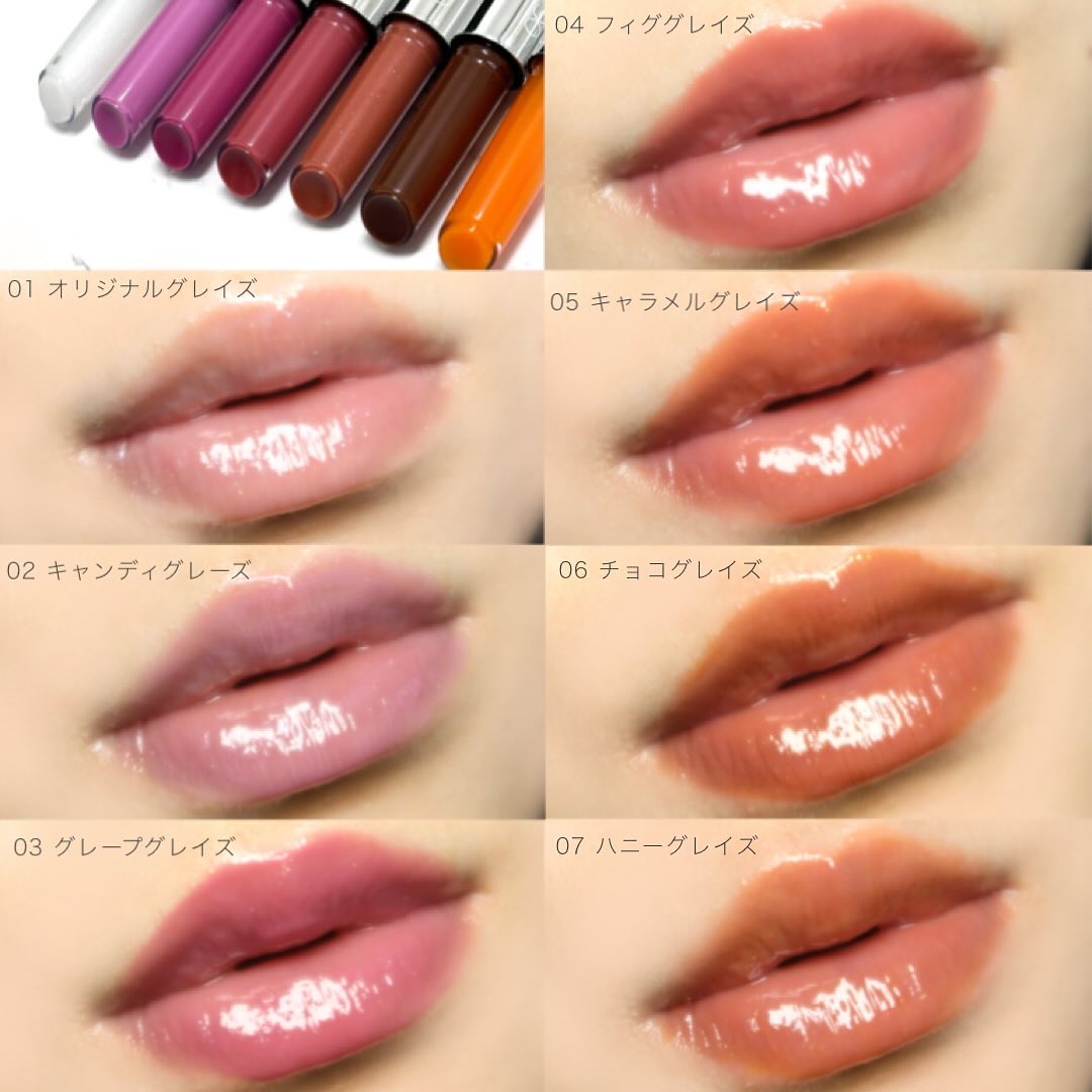 - <01 オリジナルグレイズ> ダイマージリノール酸(フィトステリル/イソステアリル/セチル/ステアリル/ベヘニル)、リンゴ酸ジイソステアリル、水添ポリイソブテン、ジ安息香酸PG、トリイソステアリン酸ポリグリセリル-2、セレシン、ポリヒドロキシステアリン酸、乳酸メンチル、合成ワックス、シリカ、(エチレン/プロピレン)コポリマー、(カプリル酸/カプリン酸)グリセリル、ホウケイ酸(Ca/チタン、エチルヘキシルグリセリン、香料、酸化チタン、酸化スズ、アボカド油、ツバキ種子油、プルーン種子油、アルガニアスピノサ核油、水、BG、ハチミツエキス、フェノキシエタノール <02 キャンディグレイズ> ダイマージリノール酸(フィトステリル/イソステアリル/セチル/ステアリル/ベヘニル)、リンゴ酸ジイソステアリル、水添ポリイソブテン、ジ安息香酸PG、トリイソステアリン酸ポリグリセリル-2、セレシン、ポリヒドロキシステアリン酸、乳酸メンチル、合成ワックス、シリカ、(エチレン/プロピレン)コポリマー、(カプリル酸/カプリン酸)グリセリル、酸化チタン、エチルヘキシルグリセリン、香料、赤202、黄4、青1、水酸化Al、アボカド油、ツバキ種子油、プルーン種子油、アルガニアスピノサ核油、水、BG、ハチミツエキス、フェノキシエタノール <03 グレープグレイズ> ダイマージリノール酸(フィトステリル/イソステアリル/セチル/ステアリル/ベヘニル)、水添ポリイソブテン、リンゴ酸ジイソステアリル、ジ安息香酸PG、トリイソステアリン酸ポリグリセリル-2、セレシン、乳酸メンチル、ポリヒドロキシステアリン酸、合成ワックス、シリカ、(エチレン/プロピレン)コポリマー、酸化チタン、(カプリル酸/カプリン酸)グリセリル、エチルヘキシルグリセリン、赤202、酸化鉄、黄5、香料、水酸化Al、アボカド油、ツバキ種子油、プルーン種子油、アルガニアスピノサ核油、水、BG、ハチミツエキス、フェノキシエタノール <04 フィググレイズ> ダイマージリノール酸(フィトステリル/イソステアリル/セチル/ステアリル/ベヘニル)、水添ポリイソブテン、リンゴ酸ジイソステアリル、ジ安息香酸PG、トリイソステアリン酸ポリグリセリル-2、セレシン、ポリヒドロキシステアリン酸、乳酸メンチル、合成ワックス、シリカ、(エチレン/プロピレン)コポリマー、酸化チタン、(カプリル酸/カプリン酸)グリセリル、酸化鉄、エチルヘキシルグリセリン、香料、赤202、黄4、青1、水酸化Al、トリイソステアリン酸イソプロピルチタン、アボカド油、ツバキ種子油、プルーン種子油、アルガニアスピノサ核油、水、BG、ハチミツエキス、フェノキシエタノール <05 キャラメルグレイズ> ダイマージリノール酸(フィトステリル/、イソステアリル/セチル/ステアリル/ベヘニル)、水添ポリイソブテン、リンゴ酸ジイソステアリル、ジ安息香酸PG、トリイソステアリン酸ポリグリセリル-2、セレシン、乳酸メンチル、ポリヒドロキシステアリン酸、合成ワックス、シリカ、(エチレン/プロピレン)コポリマー、(カプリル酸/カプリン酸)グリセリル、酸化チタン、酸化鉄、エチルヘキシルグリセリン、ホウケイ酸(Ca/チタン)、香料、赤202、水酸化Al、トリイソステアリン酸イソプロピルチタン、プルーン種子油、アルガニアスピノサ核油、アボカド油、ツバキ種子油、水、酸化スズ、BG、ハチミツエキス、フェノキシエタノール <06 チョコグレイズ> ダイマージリノール酸(フィトステリル/イソステアリル/セチル/ステアリル/ベヘニル)、リンゴ酸ジイソステアリル、水添ポリイソブテン、ジ安息香酸PG、トリイソステアリン酸ポリグリセリル-2、セレシン、ポリヒドロキシステアリン酸、乳酸メンチル、合成ワックス、シリカ、(エチレン/プロピレン)コポリマー、(カプリル酸/カプリン酸)グリセリル、酸化鉄、エチルヘキシルグリセリン、香料、赤202、トリイソステアリン酸イソプロピルチタン、ツバキ種子油、プルーン種子油、アルガニアスピノサ核油、アボカド油、水、BG、ハチミツエキス <07 ハニーグレイズ> ダイマージリノール酸(フィトステリル/イソステアリル/セチル/ステアリル/ベヘニル)、リンゴ酸ジイソステアリル、水添ポリイソブテン、ジ安息香酸PG、トリイソステアリン酸ポリグリセリル-2、セレシン、ポリヒドロキシステアリン酸、乳酸メンチル、合成ワックス、シリカ、(エチレン/プロピレン)コポリマー、(カプリル酸/カプリン酸)グリセリル、エチルヘキシルグリセリン、黄4、香料、黄5、プルーン種子油、アルガニアスピノサ核油、アボカド油、ツバキ種子油、水、BG、ハチミツエキス、フェノキシエタノール