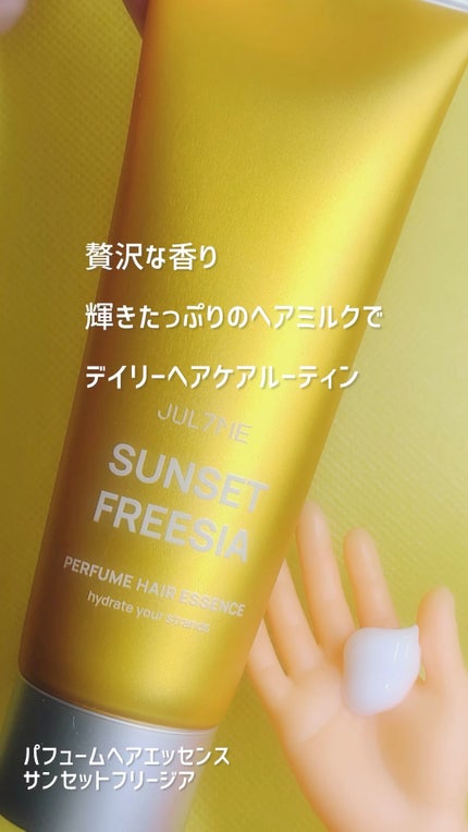 - ナイトケアや時間のない朝、お泊り、学校、会社、、など様々なシチュエーションで大活躍なJUL7MEのパフュームヘアエッセンス✨ お出かけ前にふんわりと香りをまとうヘアエッセンス。 ヘアパックに比べ、より軽やかな使用感のローションタイプで伸びが良く、乾いた髪に使用できます。お出かけ前に香水の代わりに髪になじませることで、香りが長時間持続。 ミストタイプのヘアフレグランスに比べ、香りを長時間楽しめます。植物エキスとココナッツオイル配合で髪にうるおいを補給し、ツヤ感、透明感を与えます。