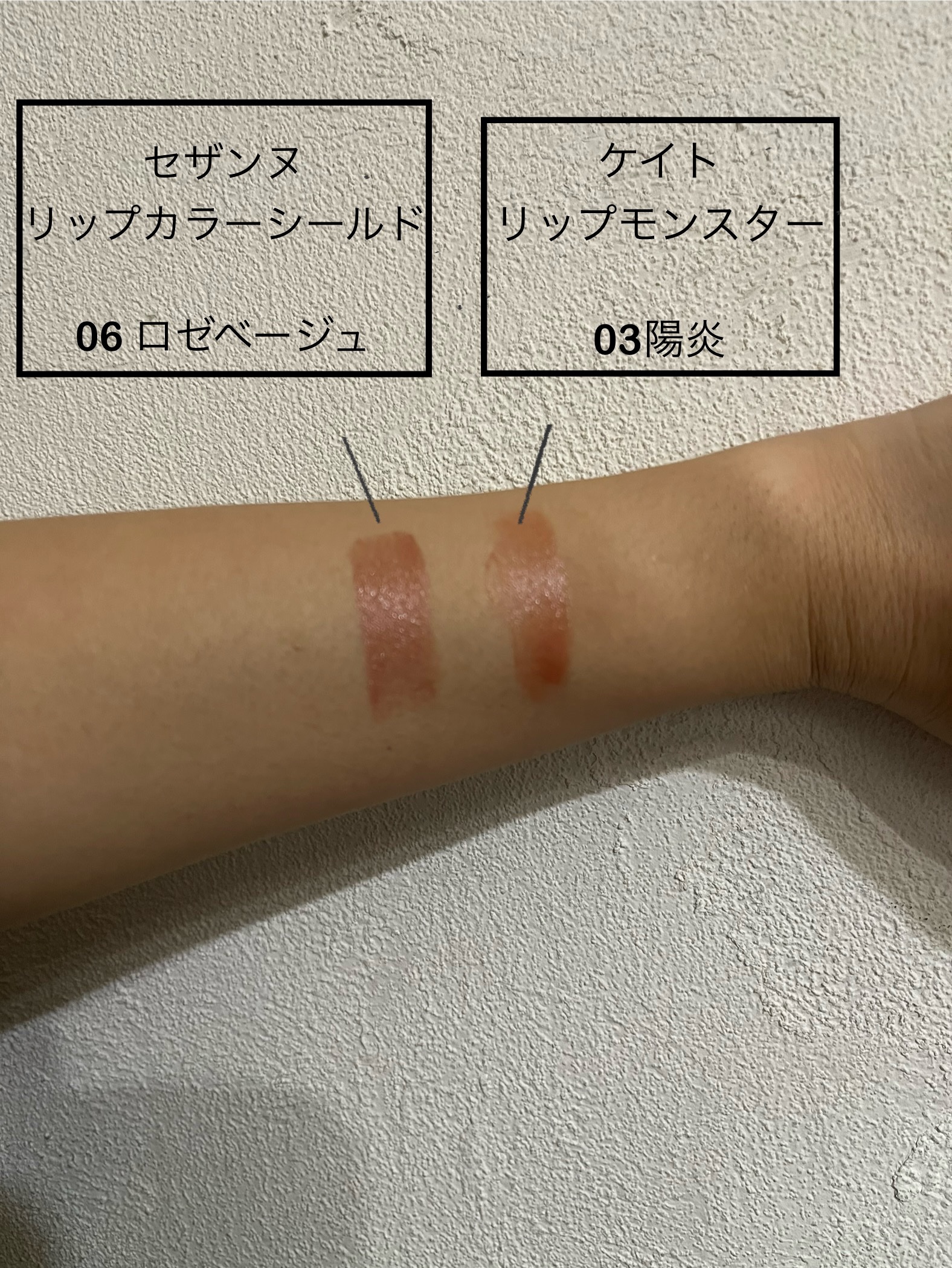 塗り心地はなめらかで落ちにくさはリップモンスターよりは落ちるけど、比較的に落ちにくい 塗ってて着け心地は潤い感とツヤ感 ベタベタ張り付く感じや乾燥感は無い 印象はリップモンスターの03陽炎を塗った時に色イメージは近いかも
