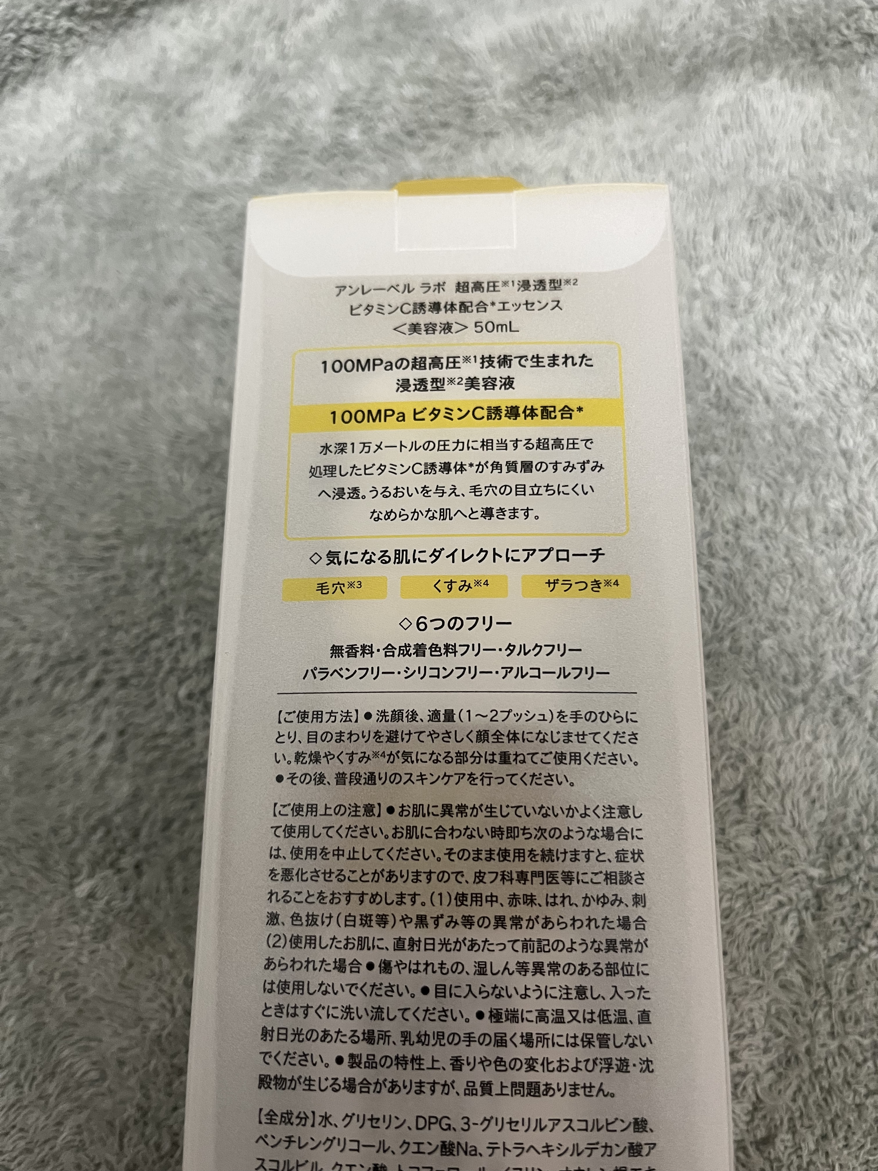 - <V エッセンス> 水、グリセリン、DPG、3-グリセリルアスコルビン酸、ペンチレングリコール、クエン酸Na、テトラヘキシルデカン酸アスコルビル、クエン酸、トコフェロール、イヌリン、オウレン根エキス、オレイン酸ポリグリセリル-10、BG、キサンタンガム、1,2-ヘキサンジオール、ピロ亜硫酸Na、フェノキシエタノール