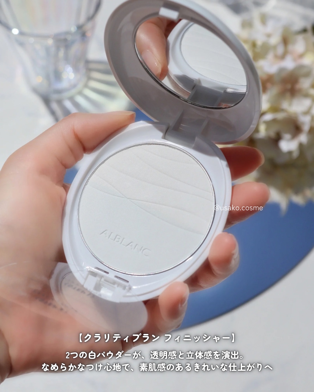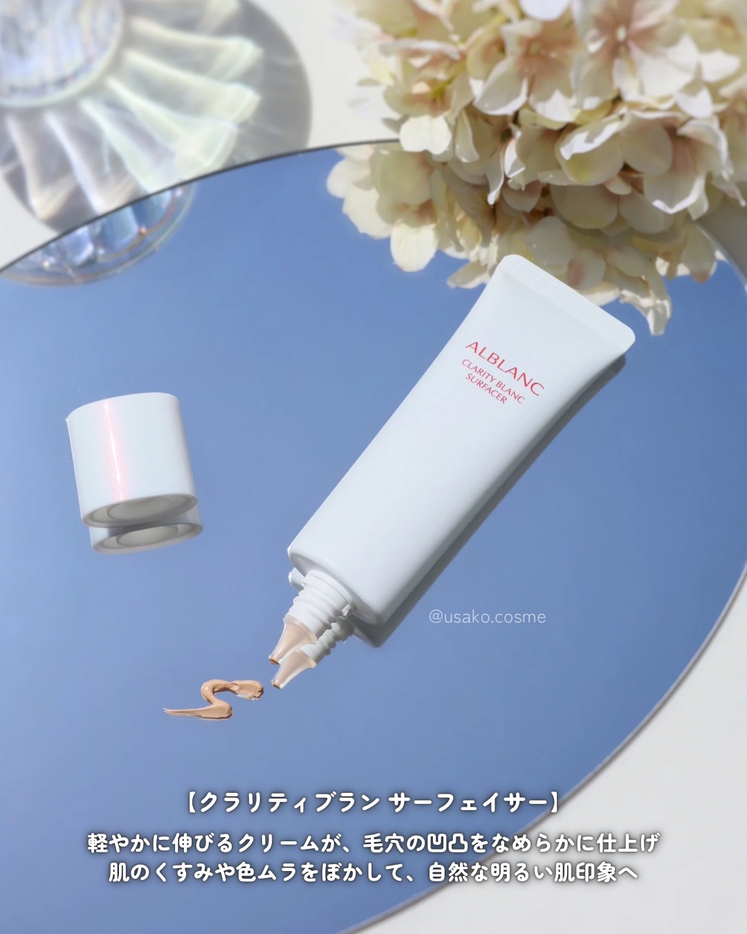 オトナの私にちょうどいい、素肌っぽいのに整って見える「フォーマル素肌感」に仕上げるのがコンセプト。 白浮きしにくく、肌になじみやすい。くすみを飛ばして肌を明るく仕上げる 簡単2ステップでオトナの素肌感を演出してくれる、アルブランのクラリティブランのサーフェイサーとフィニッシャーが今の私には合ってると思いました。