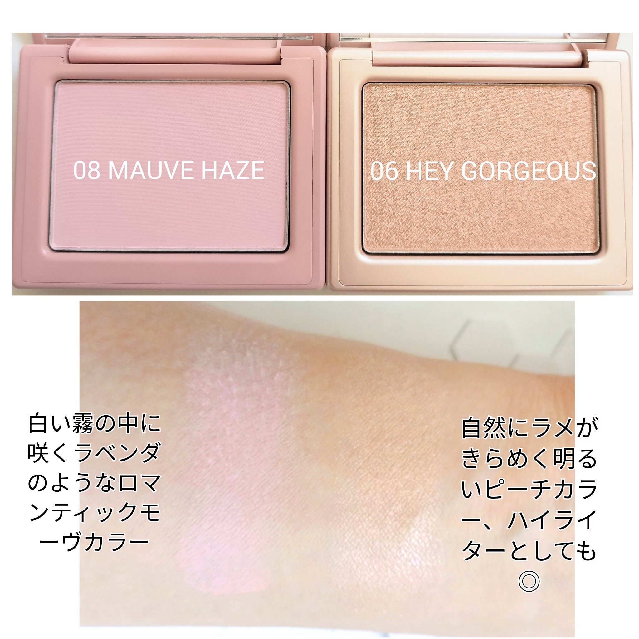 - <02 フェイバリット ラベンダー> タルク、(フッ化/水酸化/酸化)/(Mg/K/ケイ素)、マイカ、ナイロン-12、シリカ、ラウリン酸ヘキシル、ミリスチン酸Mg、リンゴ酸ジイソステアリル、フェニルトリメチコン、(ビニルジメチコン/メチコンシルセスキオキサン)クロスポリマー、ヘキサ(ヒドロキシステアリン酸/ステアリン酸/ロジン酸)ジペンタエリスリチル、ステアロイルオキシステアリン酸オクチルドデシル、ジメチコン、フェノキシエタノール、エチルヘキシルグリセリン、ミリスチン酸Al、トリエトキシカプリリルシラン、ネオペンタン酸イソステアリル、カプリル酸グリセリル、ハイドロゲンジメチコン、水、(+/-)酸化チタン、酸化鉄、カルミン <03 ライク ベージュ> タルク、マイカ、ナイロン-12、(フッ化/水酸化/酸化)/(Mg/K/ケイ素)、合成フルオロフロゴパイト、シリカ、ミリスチン酸Mg、ラウリン酸ヘキシル、リンゴ酸ジイソステアリル、フェニルトリメチコン、ヘキサ(ヒドロキシステアリン酸/ステアリン酸/ロジン酸)ジペンタエリスリチル、ステアロイルオキシステアリン酸オクチルドデシル、(ビニルジメチコン/メチコンシルセスキオキサン)クロスポリマー、ジメチコン、フェノキシエタノール、エチルヘキシルグリセリン、ミリスチン酸Al、ネオペンタン酸イソステアリル、トリエトキシカプリリルシラン、カプリル酸グリセリル、ハイドロゲンジメチコン、水、(+/-)酸化チタン、酸化鉄、カルミン、黄4、黄5 <06 ヘイ、ゴージャス> マイカ、ホウケイ酸(Ca/チタン)、ラウリン酸ヘキシル、タルク、リンゴ酸ジイソステアリル、オクテニルコハク酸デンプンAl、ミリスチン酸Mg、窒化ホウ素、ステアリン酸亜鉛、合成フルオロフロゴパイト、フェニルトリメチコン、ヘキサ(ヒドロキシステアリン酸/ステアリン酸/ロジン酸)ジペンタエリスリチル、フェノキシエタノール、エチルヘキシルグリセリン、カプリル酸グリセリル、酸化スズ、トリエトキシカプリリルシラン、ジメチコン、水、(+/-)酸化チタン、カルミン、酸化鉄、黄4、黄5 <07 アプリコット ヘイズ> タルク、マイカ、(フッ化/水酸化/酸化)/(Mg/K/ケイ素)、ナイロン-12、シリカ、ラウリン酸ヘキシル、ミリスチン酸Mg、リンゴ酸ジイソステアリル、フェニルトリメチコン、ヘキサ(ヒドロキシステアリン酸/ステアリン酸/ロジン酸)ジペンタエリスリチル、ステアロイルオキシステアリン酸オクチルドデシル、(ビニルジメチコン/メチコンシルセスキオキサン)クロスポリマー、ジメチコン、フェノキシエタノール、エチルヘキシルグリセリン、ネオペンタン酸イソステアリル、ミリスチン酸Al、トリエトキシカプリリルシラン、カプリル酸グリセリル、ハイドロゲンジメチコン、水、(+/-)酸化チタン、酸化鉄、カルミン、黄4、黄5 <08 モーブ ヘイズ> タルク、マイカ、(フッ化/水酸化/酸化)/(Mg/K/ケイ素)、ナイロン-12、シリカ、ラウリン酸ヘキシル、ミリスチン酸Mg、リンゴ酸ジイソステアリル、フェニルトリメチコン、ヘキサ(ヒドロキシステアリン酸/ステアリン酸/ロジン酸)ジペンタエリスリチル、ステアロイルオキシステアリン酸オクチルドデシル、(ビニルジメチコン/メチコンシルセスキオキサン)クロスポリマー、ジメチコン、フェノキシエタノール、カプリル酸グリセリル、ネオペンタン酸イソステアリル、ミリスチン酸Al、トリエトキシカプリリルシラン、ハイドロゲンジメチコン、(+/-)酸化チタン、酸化鉄、カルミン