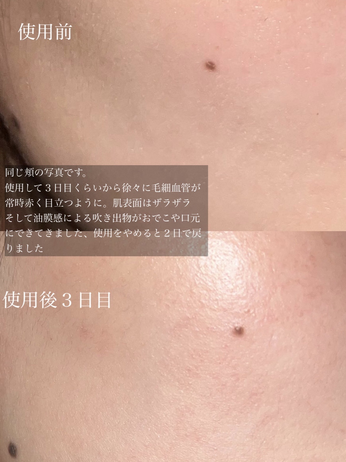 成分の65%以上に米ぬか発酵液を使用しておりその他のベース成分もBG、プロパンジオール、ペンチレングリコールなど低刺激な成分ばかりでした。 導入を促進する成分として・PEG/PPG/ポリブチレングリコール-8/5/3グリセリン・ポリソルベート80・PEG-60水添ヒマシ油という低刺激な非イオン界面活性剤と似たようなものが入っていました。 敏感肌の方はこの浸透しやすさにより普段の化粧品が刺激になってしまう可能性があるようです.. 私も2週間使い続けてだんだんと瞼に赤みが出たり普段よりもポツポツと吹き出物の数が増えてきて、合わないと判断し使用を中止しました💦