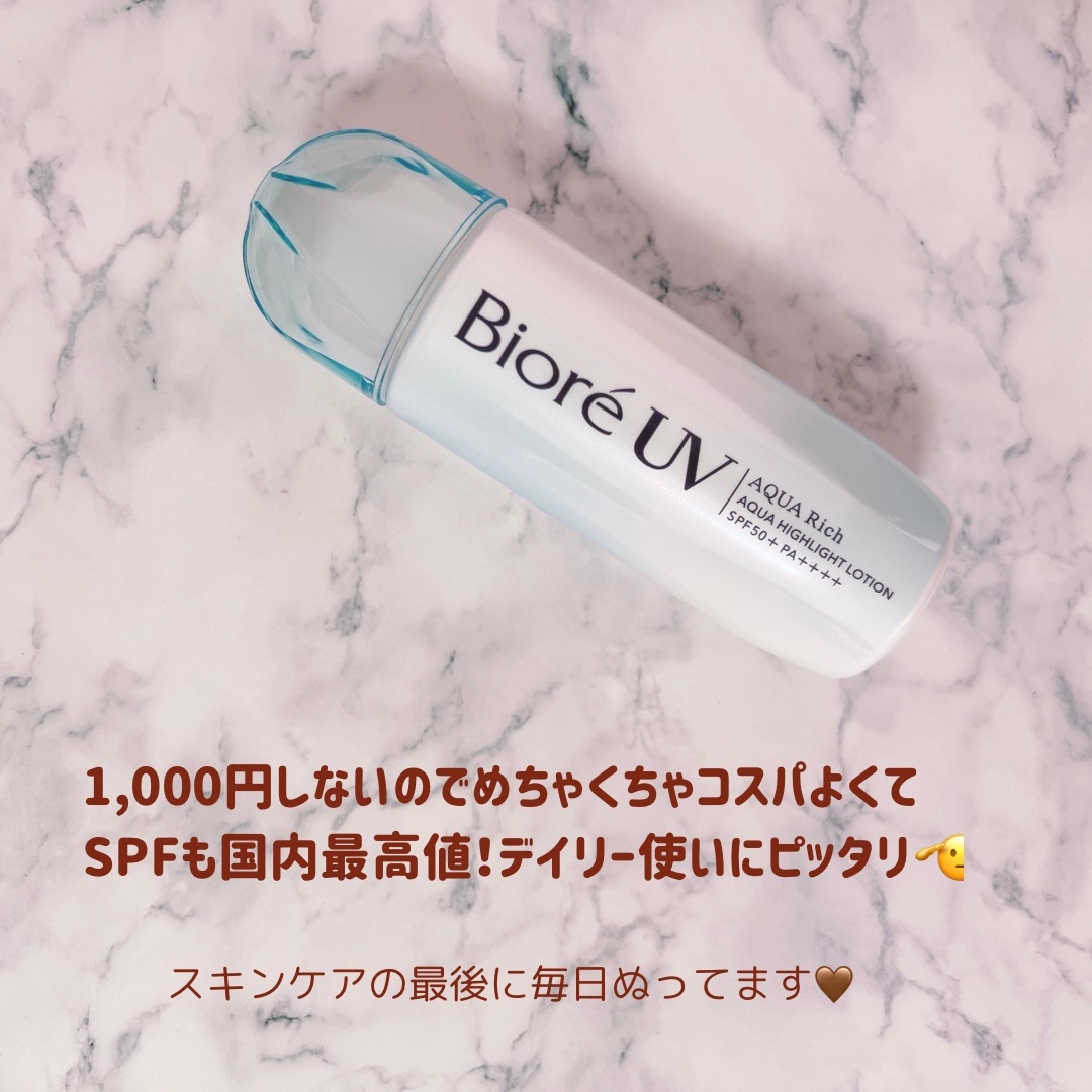 .ビオレUVアクアリッチアクアハイライトローション🌸#水層ハイライトuv身体用に購入🙌シャバシャバ系の日焼け止め。ジェルタイプに慣れてた私としてはやや使いづらい笑でも微粒のパールがすごくて、ほんとにキラキラつや感がアップ。頰、鼻筋やひたいに使...