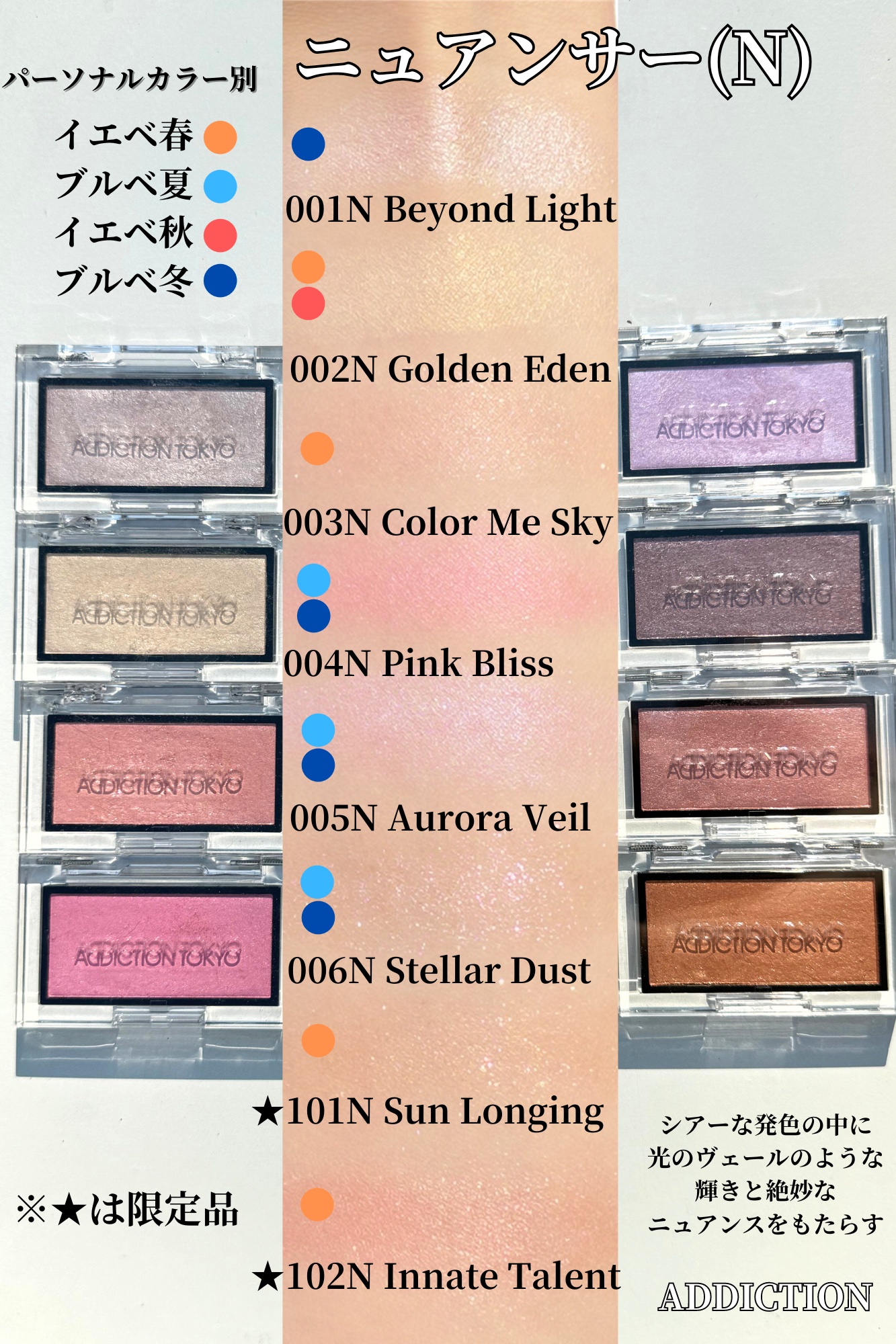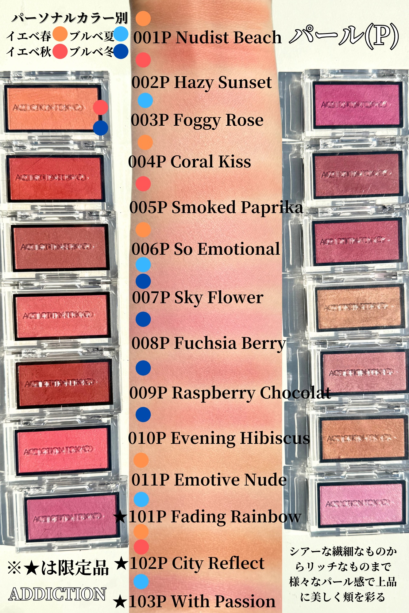 リニューアル後のアディクション ザブラッシュ全色レビュー■マット(M)鮮やかな発色としっとりとした質感で肌に溶け込むように自然になじむ001MSaharaSunイエベ春イエベ秋002MMimosaSunriseイエベ春イエベ秋003MWild...