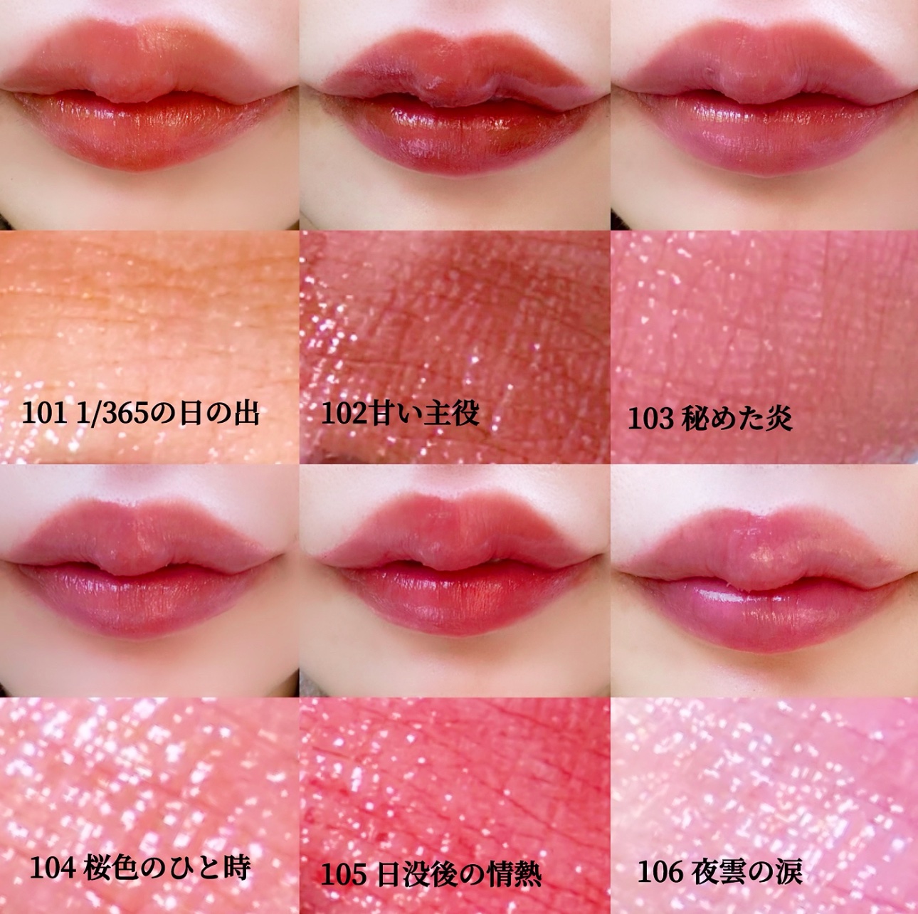 KATE リップモンスター 102 甘い主役 103 秘めた炎 104 桜色のひと時 106 夜雲の涙 107 紅折り紙の願い 110 闇夜のファンファーレ 112 真夜中の褒美 手持ちの7色を並べてみました #KATE #リップモンスター #マイリップモンスター
