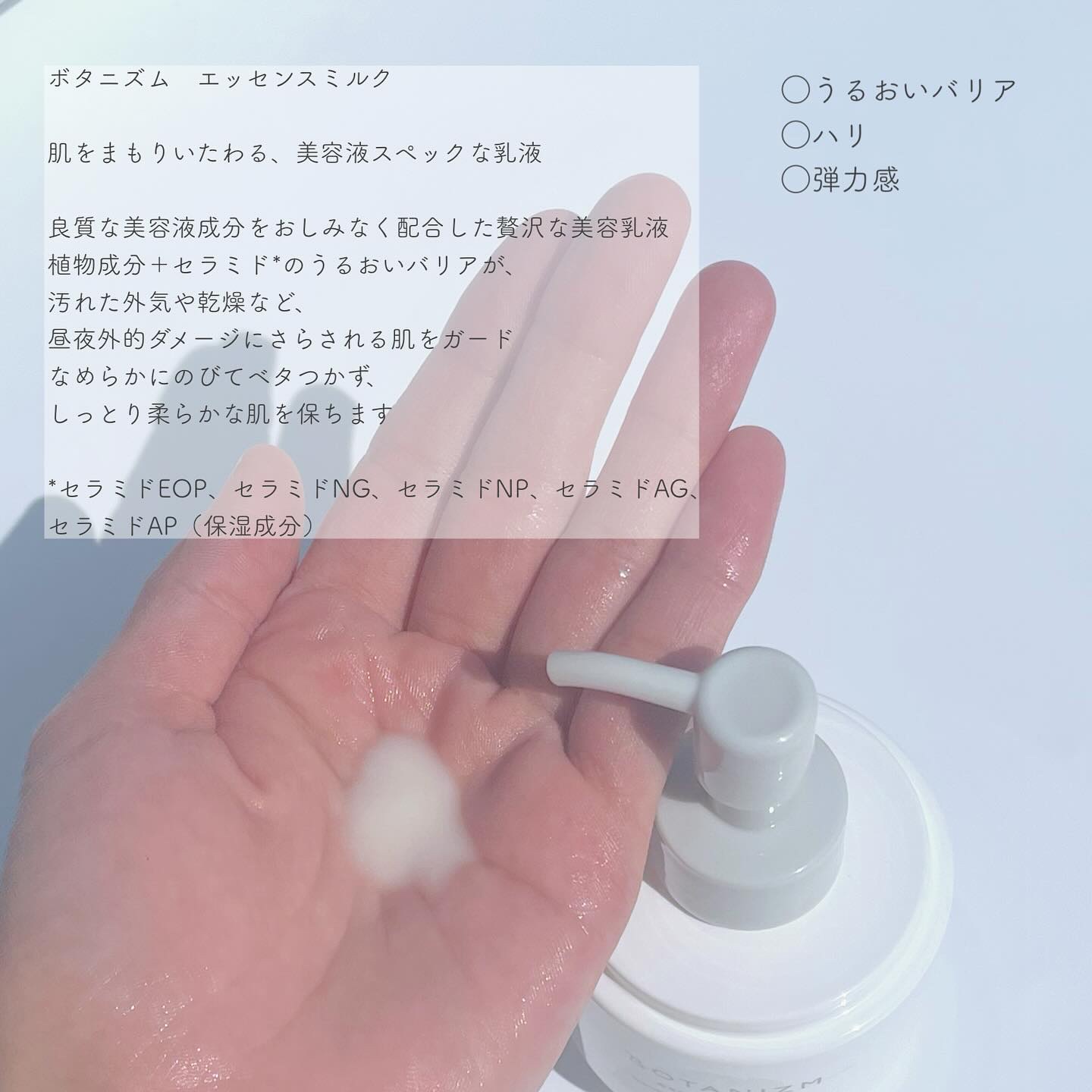 ボタニズムってどんなブランド? 植物✕ケミカル成分の組み合わせで作られていて、それぞれの良いところを取り入れている。中でも、肌のハリ不⾜に注⽬していて、レモンバームエキスをはじめとする国産の植物成分を配合している。 香りは天然精油を使用している。柑橘系の香りで、ジェンダーレスに使用できる。