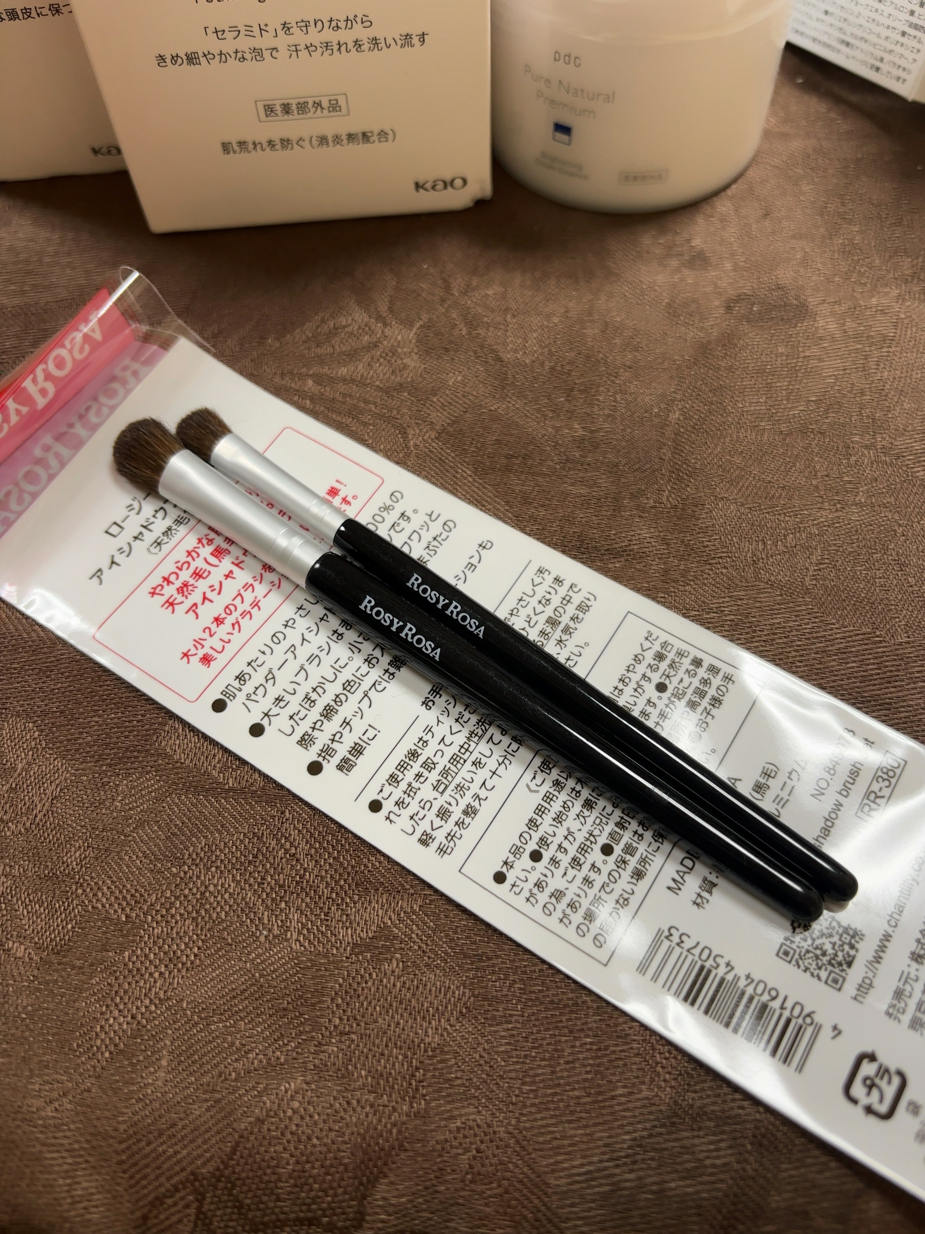 ロージーローザアイシャドウブラシセット ¥528天然毛100%のパウダーアイシャドウ専用ブラシ。大きいブラシはまぶた全体やフワッとぼかす用、小さいブラシはまぶたのキワや締め色にオススメ。チクチクせず、肌辺りが良かったです。アイシャドウをふんわ...