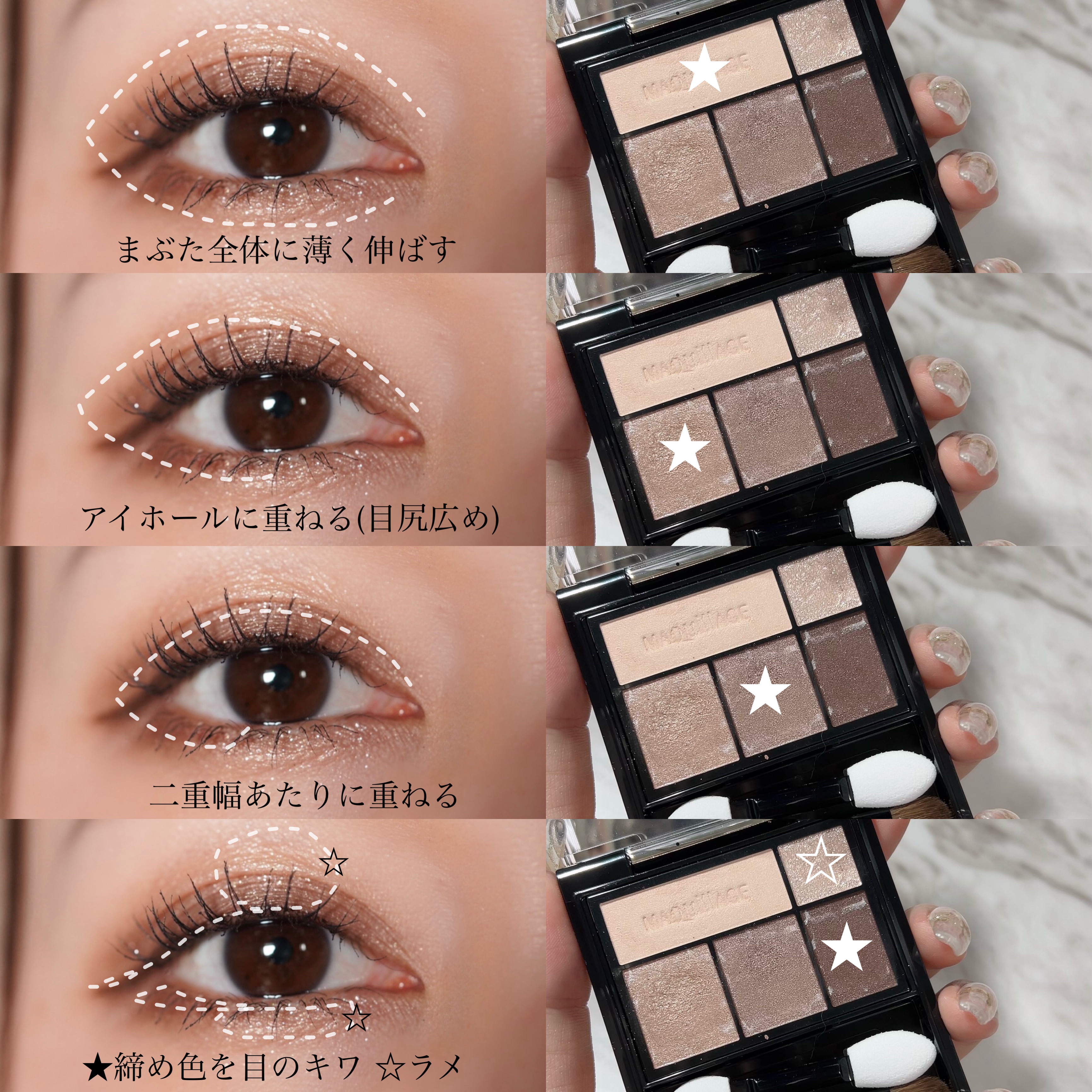 よくパレットのなかで明るいカラーをベースにまぶたに広く塗ることが多いのですが、パール感のあるカラーを避ける🙆♀️! パール感たっぷりの明るいカラーは涙袋に使うぐらい光を集めてぷっくり見せてくれるので、まぶたに広く使うと腫れぼったく見えがち😓 目元を明るくみせてくれたり、次に使うアイシャドウをぼかしやすくしてくれるけど、すっ飛ばしてメインのカラーを塗っちゃう✊🏻❤️🔥 涙袋にはたっぷり塗ってぷっくり見せる🙆♀️💕 シルキースフレアイズのマットタイプはすごく優れているな〜と感じました☺️💗 赤やオレンジなどは、入れすぎると腫れぼったく見えやすいので、見せたいカラーは下まぶた目尻にのせて色をたのしむ♡♡ パール感なしの透けマットだけじゃ物足りない… そう感じさせない華やかなラメが左上に入っているので黒目上と涙袋にのせるとすごく可愛い仕上がりに😍! 厄介な左右差のお陰でマットアイシャドウが好きになりました😌💕