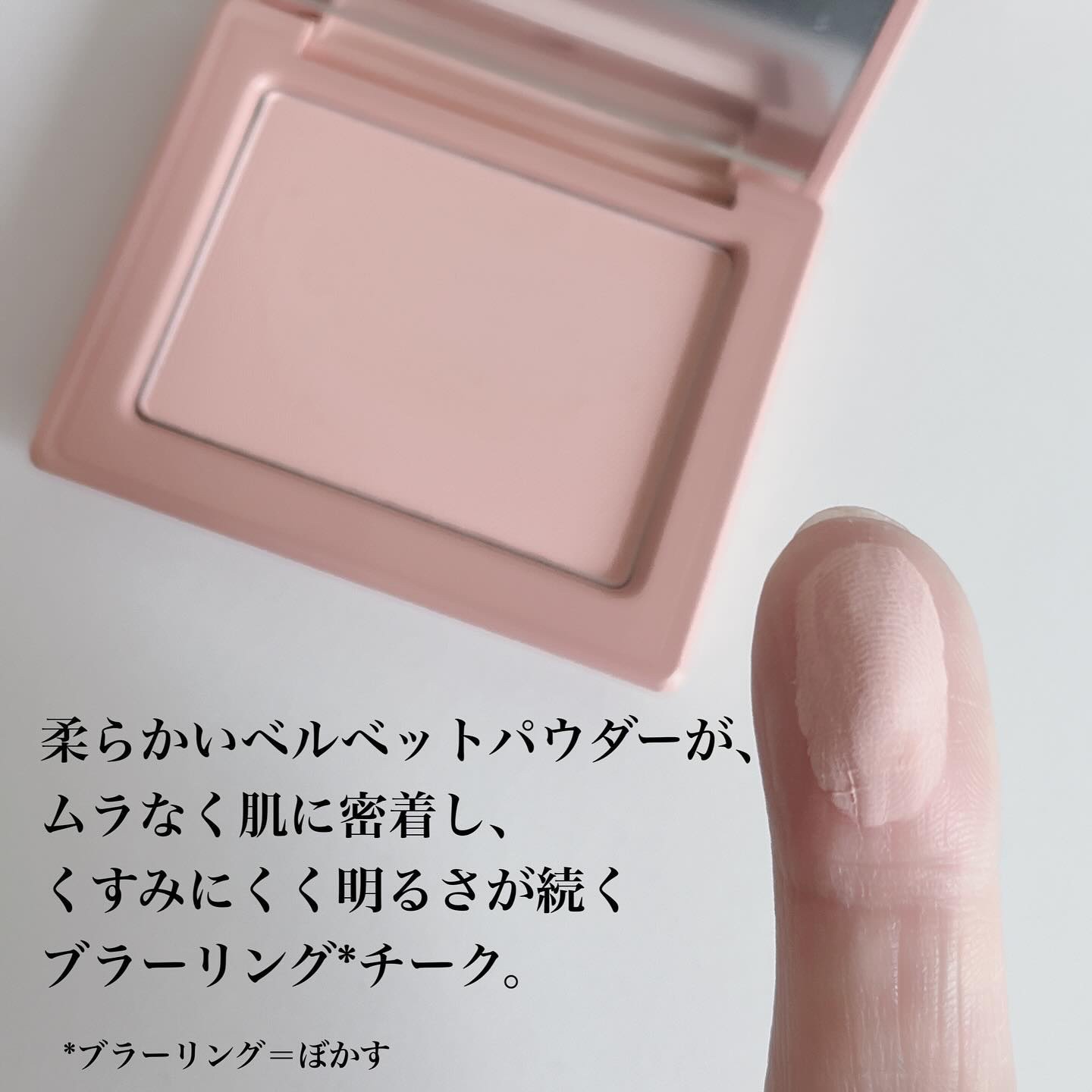 - 柔らかいベルベットパウダーがムラなく密着し、 くすみにくく明るい印象が続くブラーリングチークです。