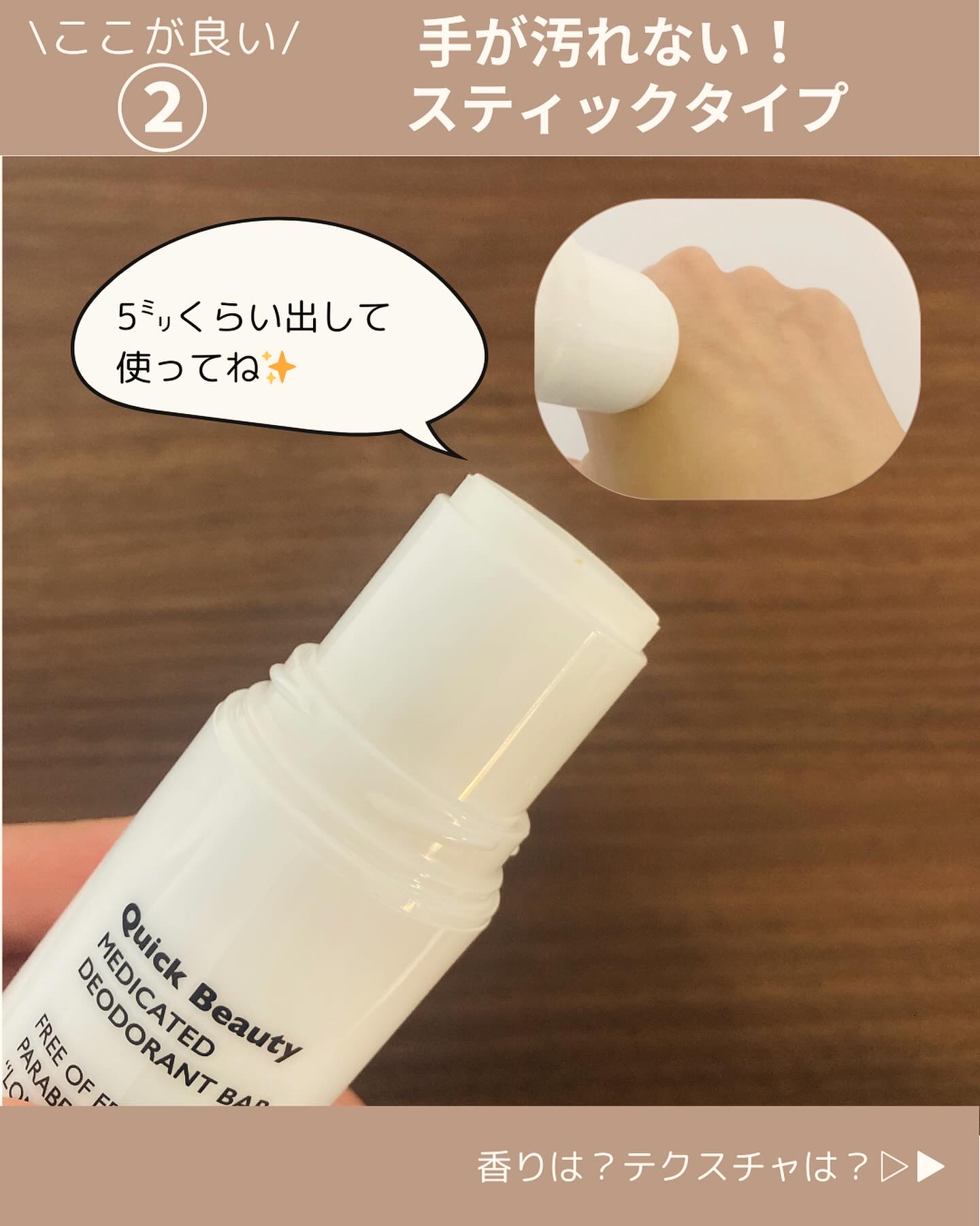 #PR#クイックビューティー@liberta_itemさまからいただきましたクイックビューティー薬用デオドラントバー表面サラサラ、ベタつき香り無くて◎夏本番はクセがないものが使いやすい🥹✨密着力が高く、汗・水・こすれ*に強く手を汚さず使えるス...