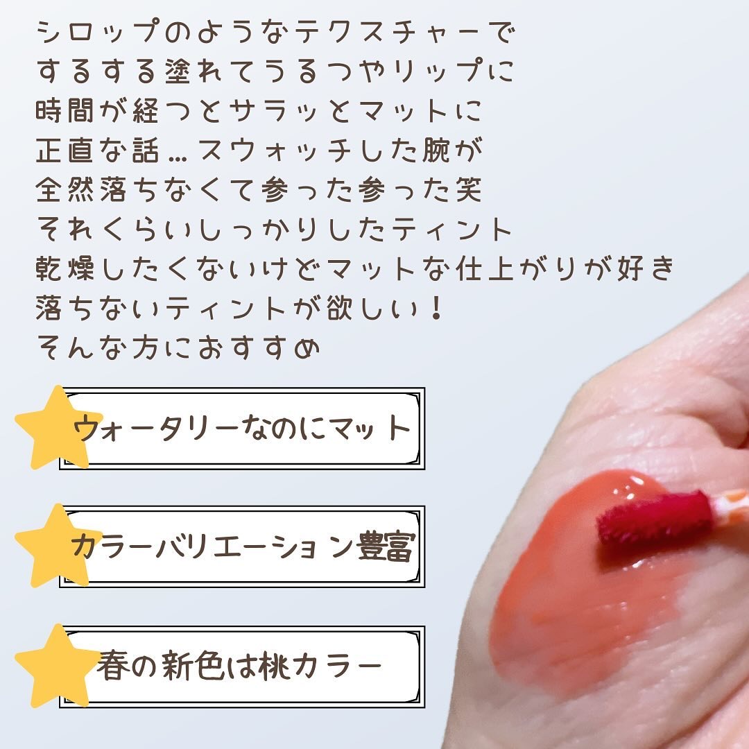 シロップのようなテクスチャーで するする塗れてうるつやリップに でも時間が経つとサラッと マットに仕上がります それくらいしっかりしたティント 出先でも落ちづらいのは嬉しい◎