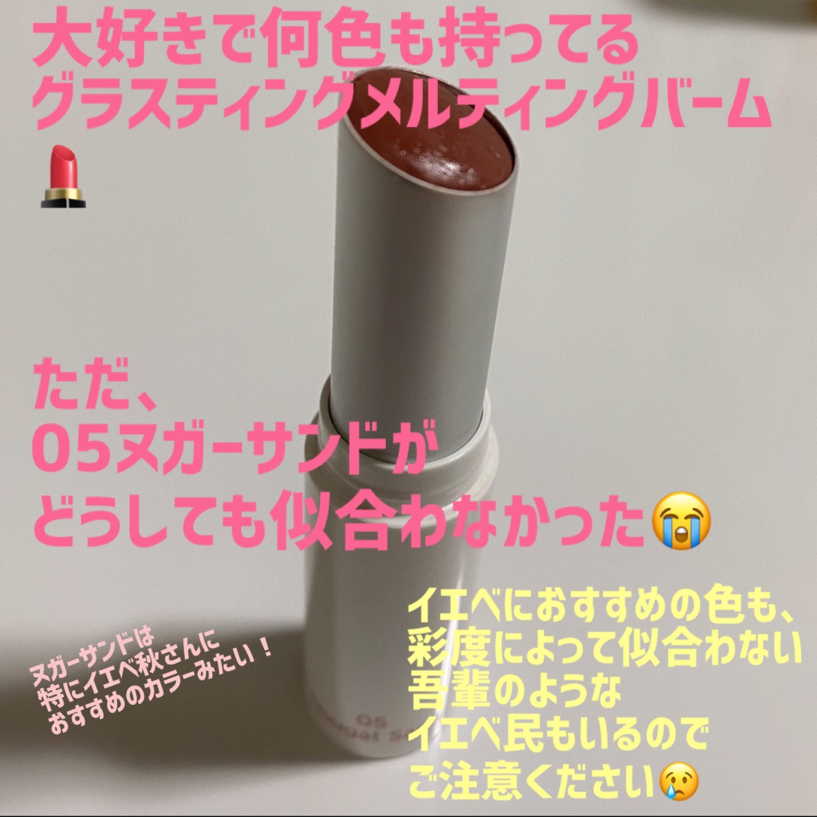 体温で柔らかくなるリップバーム。高音の場所に長時間置かないでほしいとのこと! 05 ヌガーサンドはふわっと溶けるクリームのようなヌガーブラウン 私の肌や唇だとコーラルベージュのような色に発色しました。 色・ツヤ・むりっちり感、どれも派手になりすぎず使いやすかったです🫶 バームだから乾燥しずらくて良かったけど、その分もちはよくないかな?