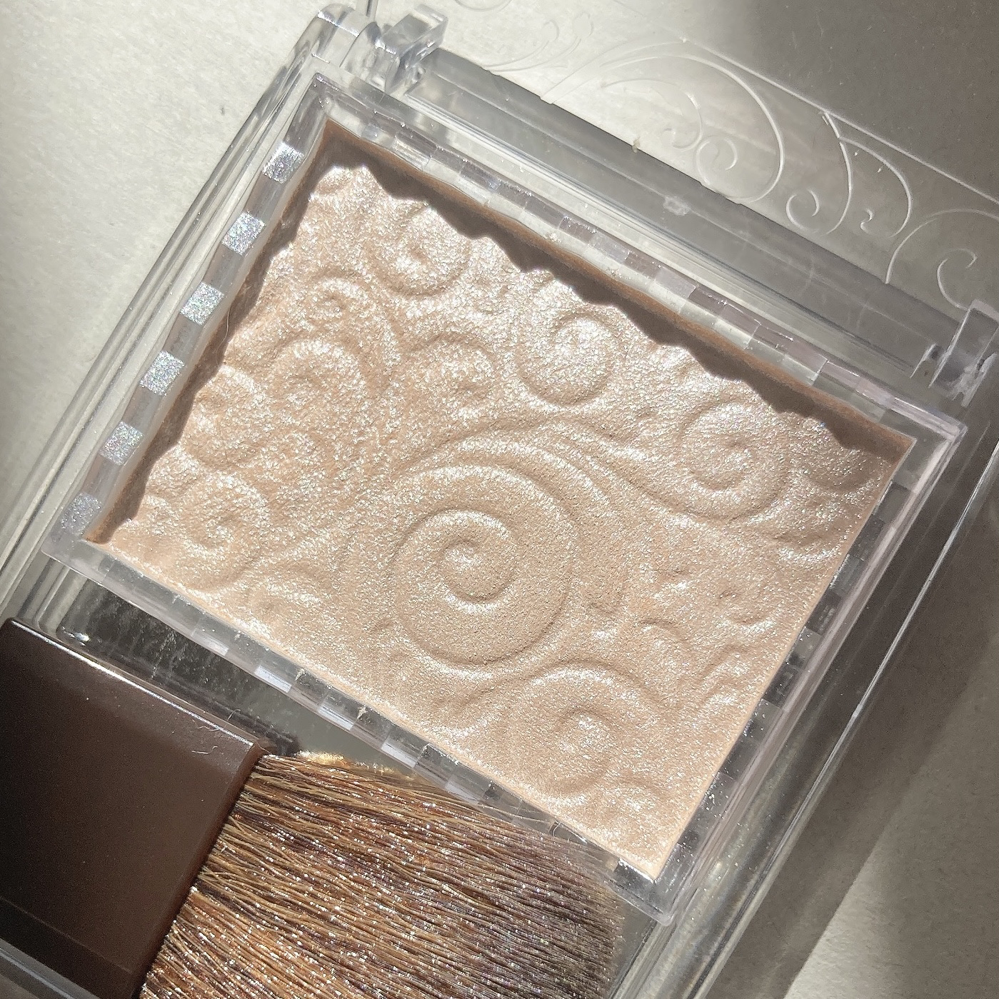 光の加減によってチョコレートカラーになったりレッドブラウンになったり不思議な絶妙カラー。 ピンクラメの他にもグリーンラメもチラチラして、なんかもうめちゃくちゃ綺麗です🥰 でもそんなにラメ感は派手でなく、自然。 見た目以上にニュアンス発色なのでメイクに深みを出したいときにちょい足しするにも便利◎ さらっとした粉質は好き嫌いがわかれそうですが、個人的にはぼかしやすくて好き👏