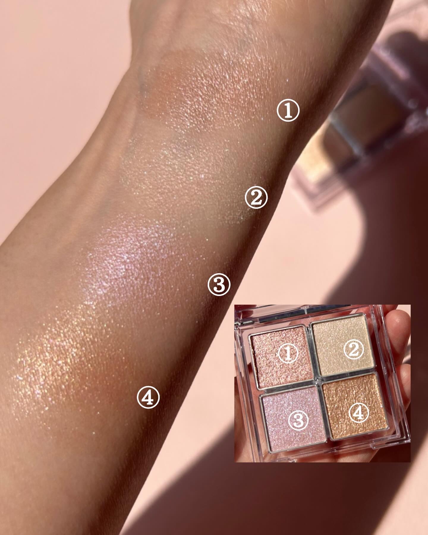 - 使う場所を選ばない、まばゆいパールが立体感をあたえるハイライトパレット。全てがハイライトカラーとなっており、まぶた、涙袋、頬、鼻筋など様々な場所に使えるハイライトカラーとなっております。 トレンド感満載の4色となっており、季節・シーンを問わずお使いいただけます。