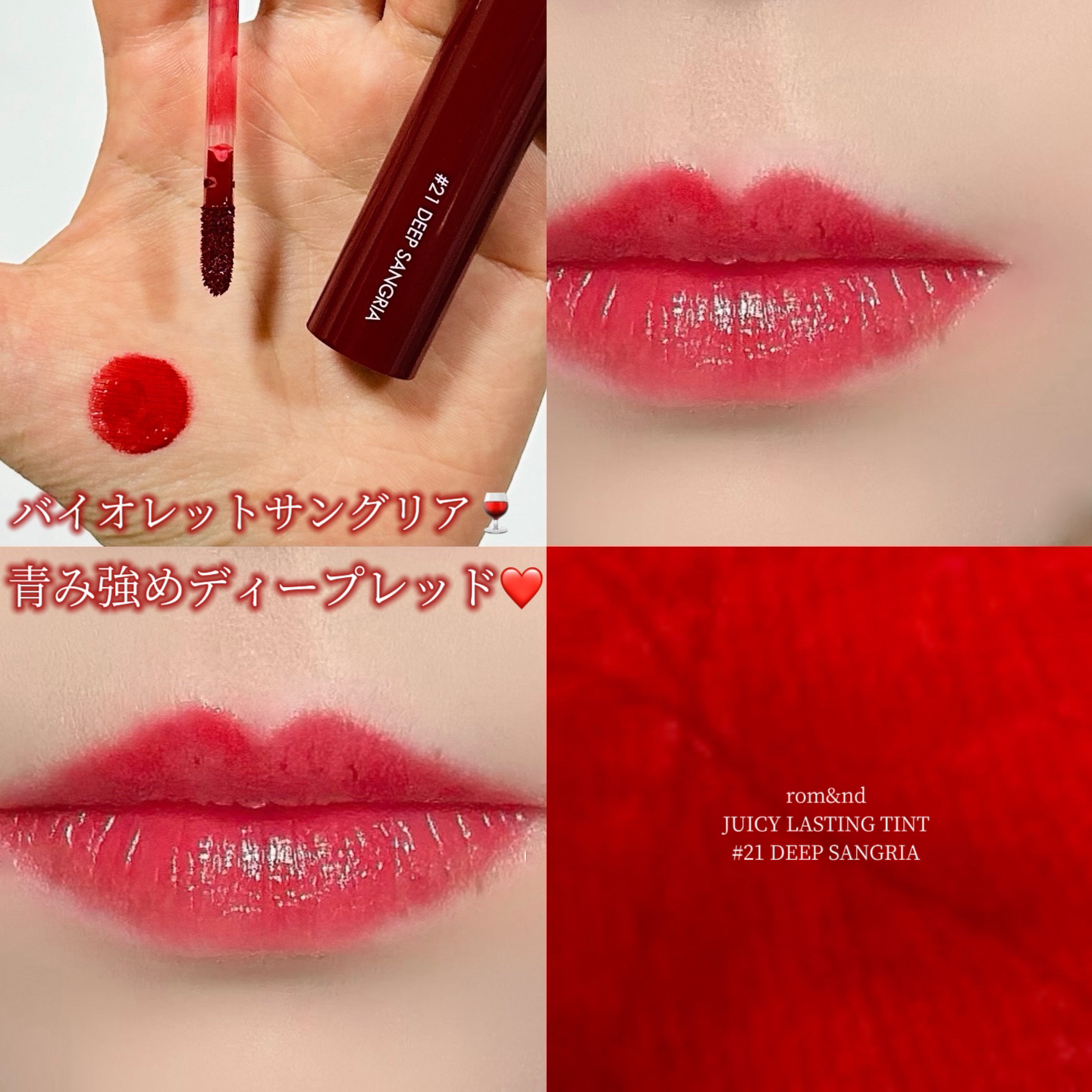rom&ndのジューシーラスティングティントリメイク前バージョンです。#12CHERRYBOMB#17PLUMCOKE#21DEEPSANGRIAシロップを唇につけるような粘り感😂何回を分けて重ねていく方が綺麗に塗られますが、すごく時間かかり...