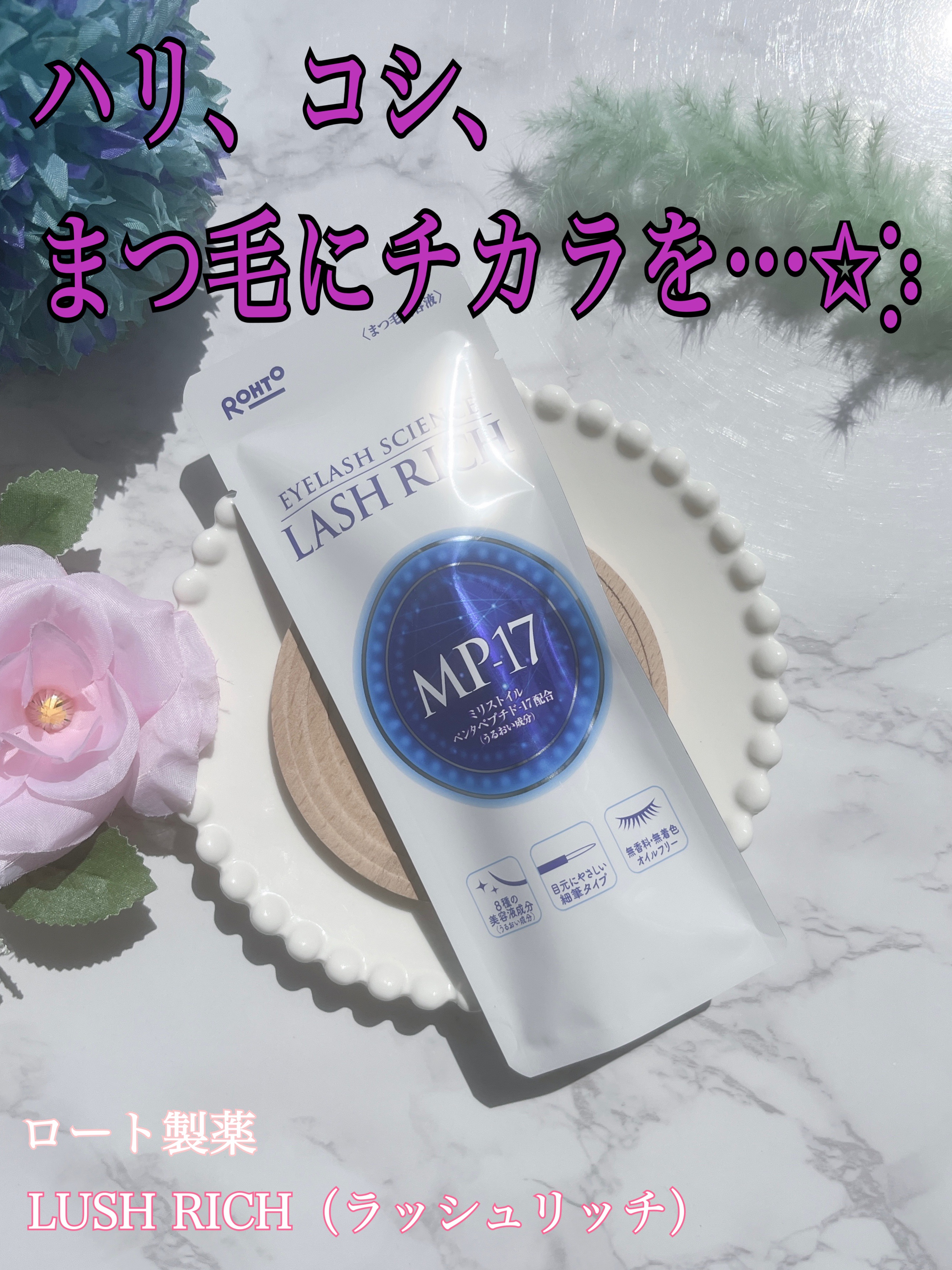 LASH RICH(ラッシュリッチ)は、MP-17、コラプラス®️を含む8種の美容液成分を配合したまつ毛美容液! 美容液は、まるで液体のような、かなりサラッとしたテクスチャーで、ベタつき感もありません◎ まつ毛の密度が濃くなってきたような気がします…! まつ毛の周期は、約3ヶ月と言われてるようなので、今後もコツコツと継続してケアしていきたいと思います☺️
