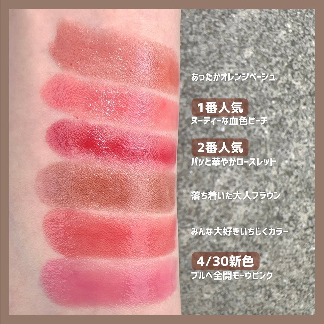 | リップティントランキング第3位 | 重ねて塗っても、ちゅるんと透け感が残って明るめカラーがとっても映える…💕色残りも◎ | 詳細を見る | ||