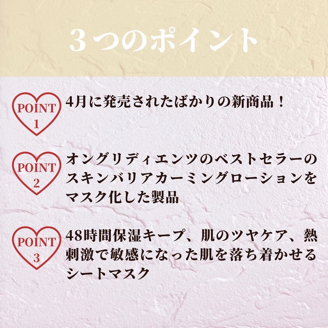 ツボクサエキス配合で刺激をうけた肌を落ち着かせる🌿 オングリディエンツのベストセラー乳液を1枚に込めた高保湿シートマスク 乳液と同じ濃密なエッセンスたっぷりのシートが、顔にぴったり密着 マイルドな使用感だから、肌荒れ時にも使いやすいのもありがたい 保湿力があって、たっぷり水分補給できてる感じがする 乾燥肌に嬉しい使用感です🙆