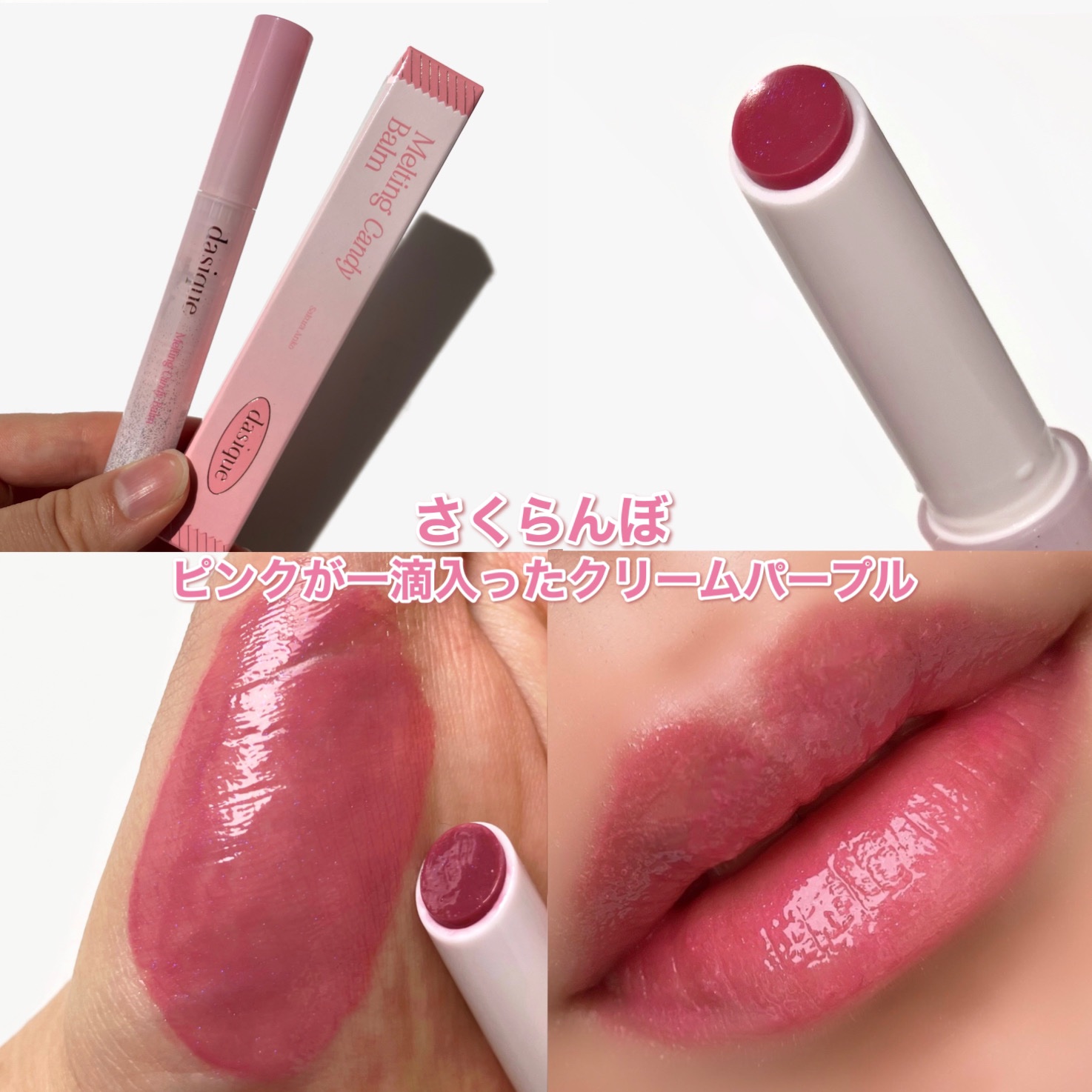 ちゅるんとあめ玉のような光沢感! むちっとした厚みのある唇に仕上がる♡ さくらあんは桜の餡のように甘いミルキーピンク。 ピュアな感じで可愛いの! 唇にのせるとバームがとろけてむちっとしたテクスチャーに。 スティックが細いから唇の山や口角も塗りやすいの。