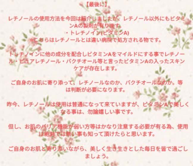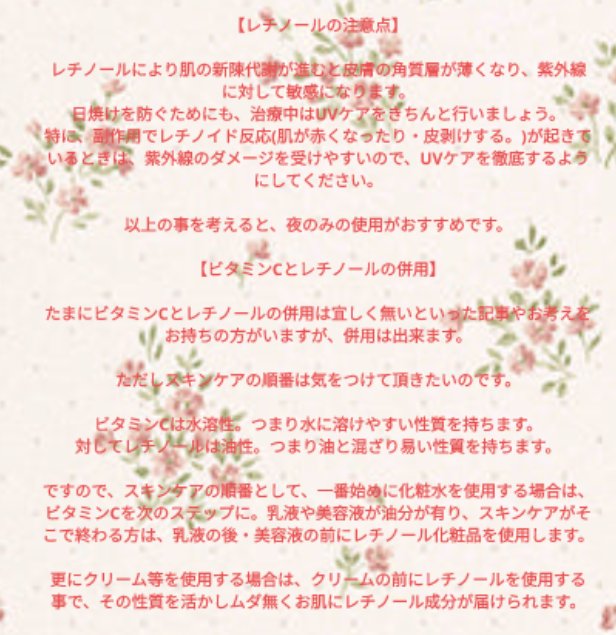 こんにちは、コメント失礼します。 いいねもたくさんつけてくださりありがとうございます😊 この記事すごく参考になりました! ビタミンCとの併用の場合は、化粧水→ビタミンC→レチノールということでしょうか? 質問すみません💦