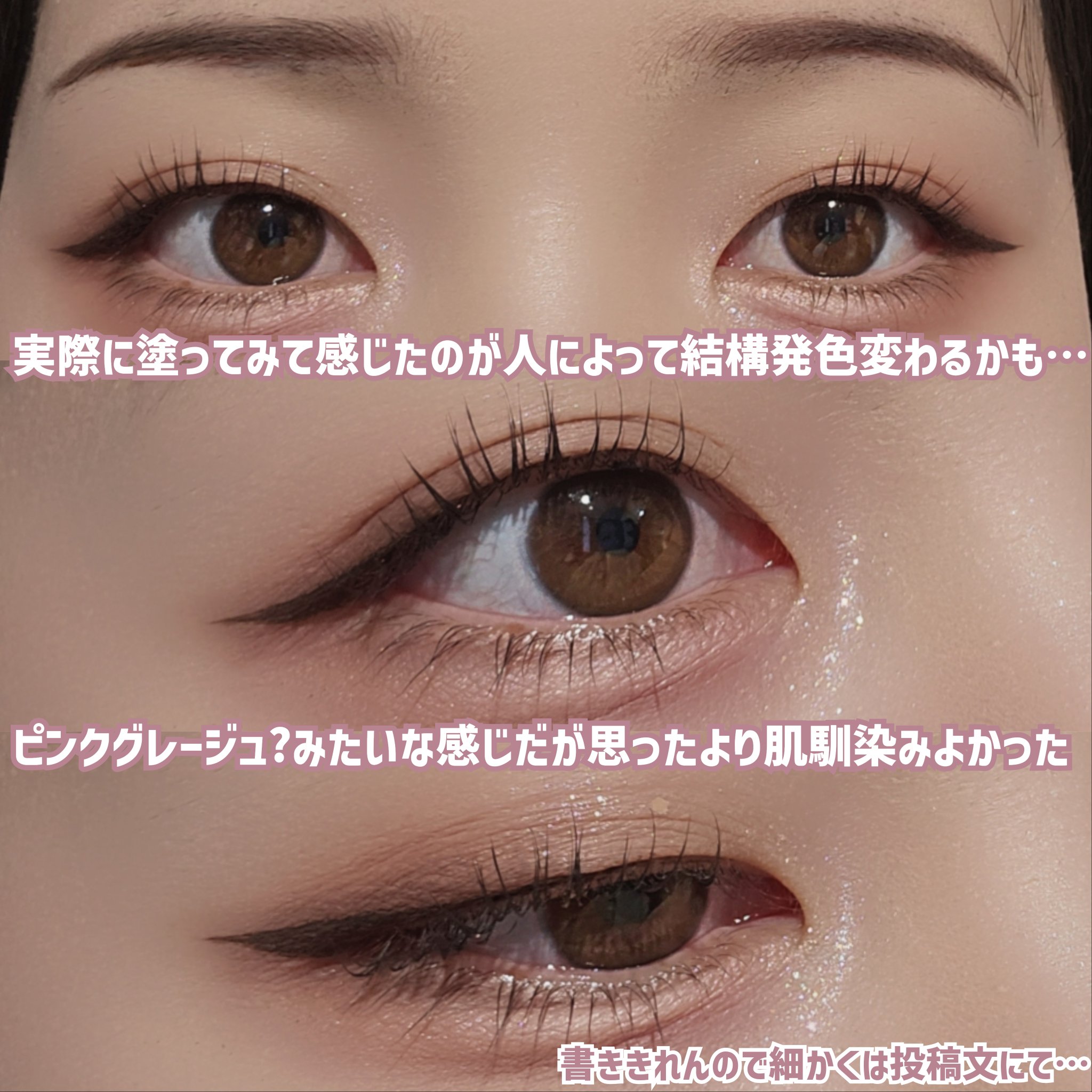 01シアーブラックを初めて使った時に感動し ヌードアイラッシュは基本的に売り切れてるので… 03のシアーグレーをGETしたのですが 太陽に透かすと03シアーグレーは やはり液が半透明のブラウンで 繊維は黒なので 色味に大きな差はなく ブラウンでも繊維が黒なので目力が死なないのも◎ カールキープもお湯落ちとは思えないくらい良い、 ダマにもならずスっとキレイなセパレートまつげが 簡単にできてとっっってもお勧めですわ…!