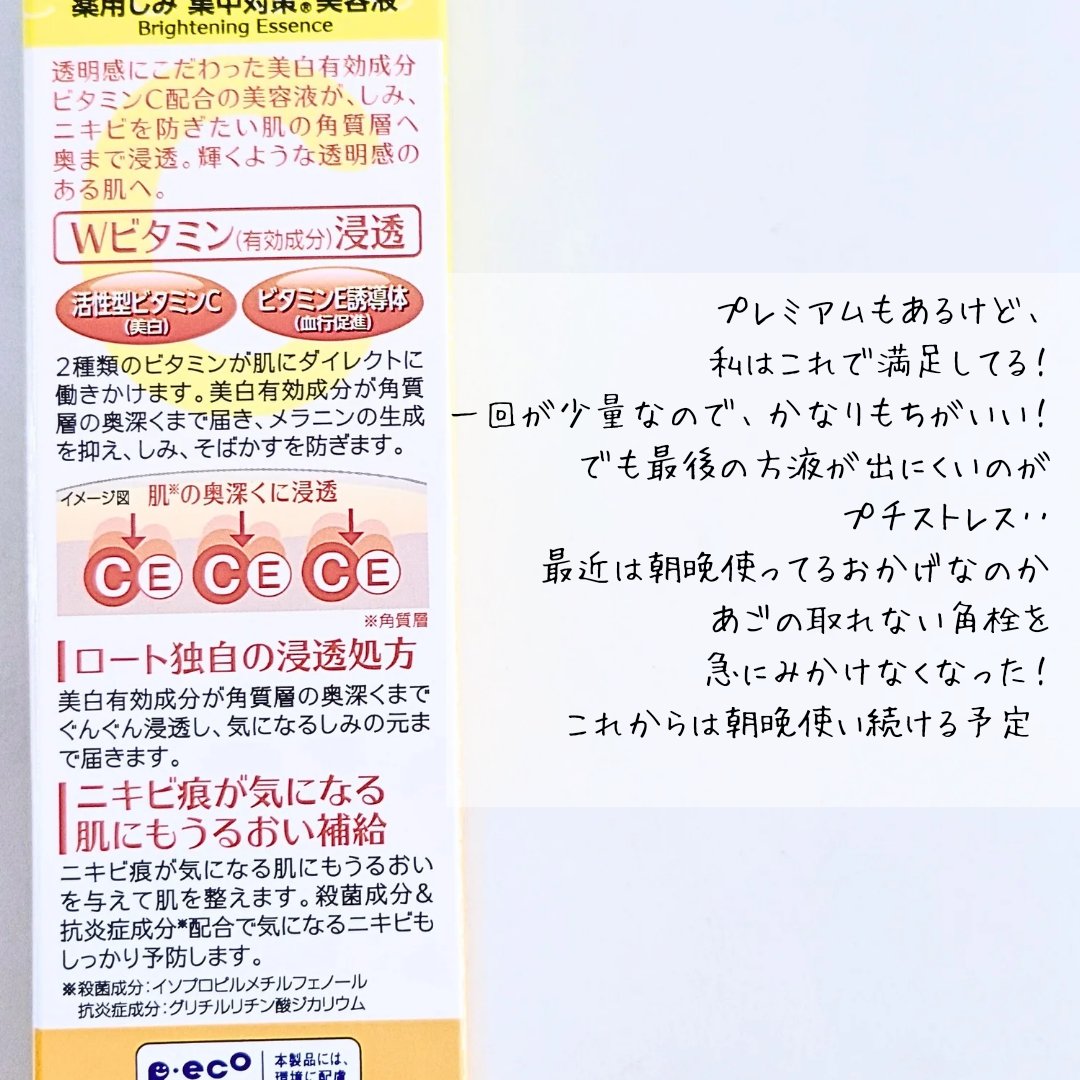 - Wビタミン配合。しみ・ニキビを防ぐ。 透明感にこだわった美白有効成分「活性型ビタミンC*1」配合の薬用美白美容液。 美白有効成分「活性型ビタミンC*1」と整肌成分「ビタミンE誘導体」をWで配合。2種類のビタミンが肌にダイレクトに働きかけます。ロート独自の浸透処方で、美白有効成分が角質層すみずみまで届き、メラニンの生成を抑え、しみ、そばかすを防ぎます。 さらに2つの有効成分*2とうるおい成分アルピニアホワイトも配合。気になるニキビもしっかり予防し、ニキビ痕が気になる肌にもうるおいを与えて肌を整えます。 ベタつかない使用感のリキッドタイプ。使いやすい滴下式チューブです。化粧水の後でお顔全体に使ったり、お手入れの一番最後でポイント使いをしたり、お好みで朝晩のお手入れにどうぞ。 *1:アスコルビン酸、*2:イソプロピルメチルフェノール(殺菌成分)、グリチルリチン酸ジカリウム(抗炎症成分)