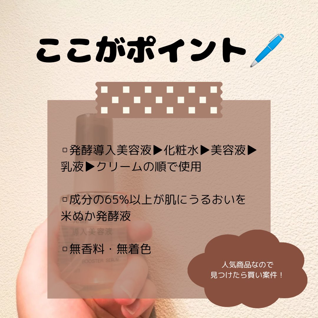 人気の発酵導入美容液!良品週間があったので購入してみました🫶 化粧水の前に使います。とろみのあるテクスチャー。私はベタつきは気になりませんでした。 これをつけてから化粧水や乳液をつけると、いつもより肌がしっとりしているように感じました。量が少なめなので、詰め替え用を作るか、サイズが大きくなるといいな。