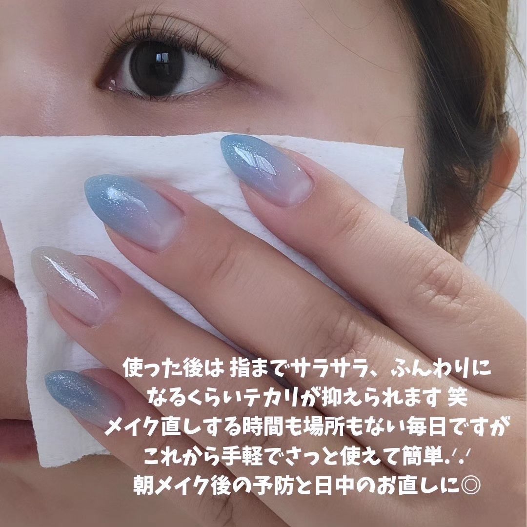 1枚でさっとふんわりメイク直し。メイクの上から押さえるだけで「ふんわりぼかしパウダー」が肌の上にオン。毛穴、テカリ、肌のトーンなど日中気になってくるメイク肌をほどよくぼかします。 無香料・無着色です。Tゾーンのテカリ・ファンデの毛穴落ち防ぐ「さらマット肌持続シート」。テカリが気になった時に、メイクの上からじんわり押しあて、「皮脂吸収ヴェール」をオン。 使用後のほうがキレイに見えます。しばらくするとサラッサラになるので、メイク直しもとっても快適。