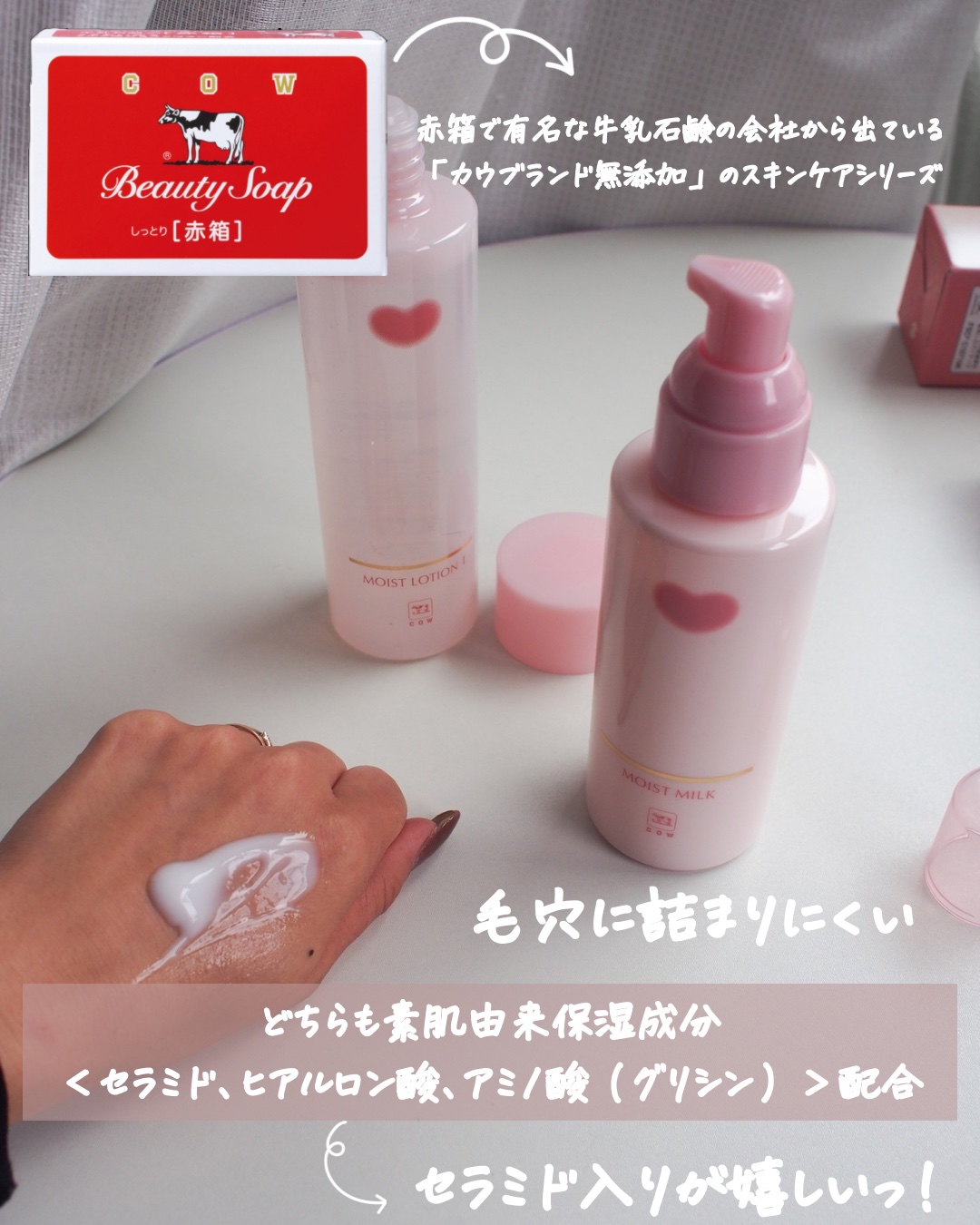 赤箱で有名な牛乳石鹸🐄の会社から出ている「カウブランド無添加」のスキンケアシリーズ🧴✨ 伝統のあるブランドから出しているスキンケアだから信頼できる! 保湿化粧水とてもしっとり伸びがいいのにとてもしっとり🌿 保湿力あるのにベタつかないのが嬉しい🥺 肌本来のうるおいに不可欠な「素肌由来保湿成分」が、肌の奥(※)までスーッと浸透し、うるおいに満ちた透明感のある肌へ。
