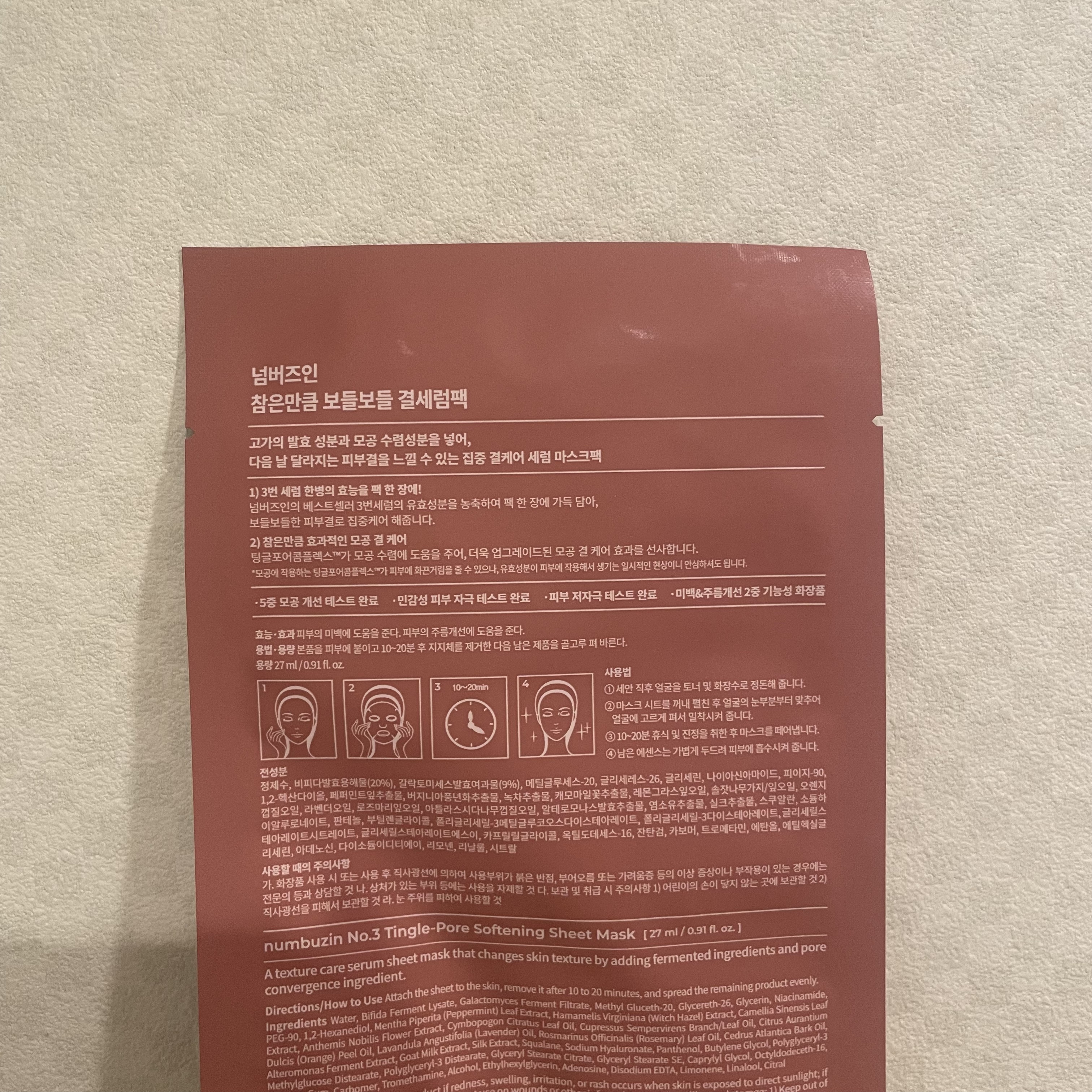 発酵成分と肌ひきしめ成分のW配合 ナンバーズイン3番セラムの濃縮された発酵成分を1枚に入れ込み集中ケア。 つけた時はなんの刺激もなく、5分位するとじんわり温かい少しヒリヒリっとするけど痛みは感じない程度でした❤️🔥👍🏻 確かに引き締め感は感じるけど、ピーリング後のようなツルツル感までは私は感じなかったです。