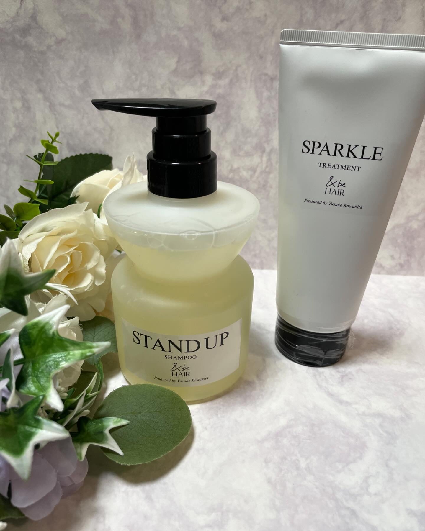 \ふんわりボリュームアップと/ \上品な光沢を!/\柔らかい髪質向けのシャントリ/おなじみヘアメイクアップアーテイスト河北裕介さんのブランドの「&beスタンドアップシャンプー」「&beスパークルトリートメント」を紹介します。フラワーベースを...