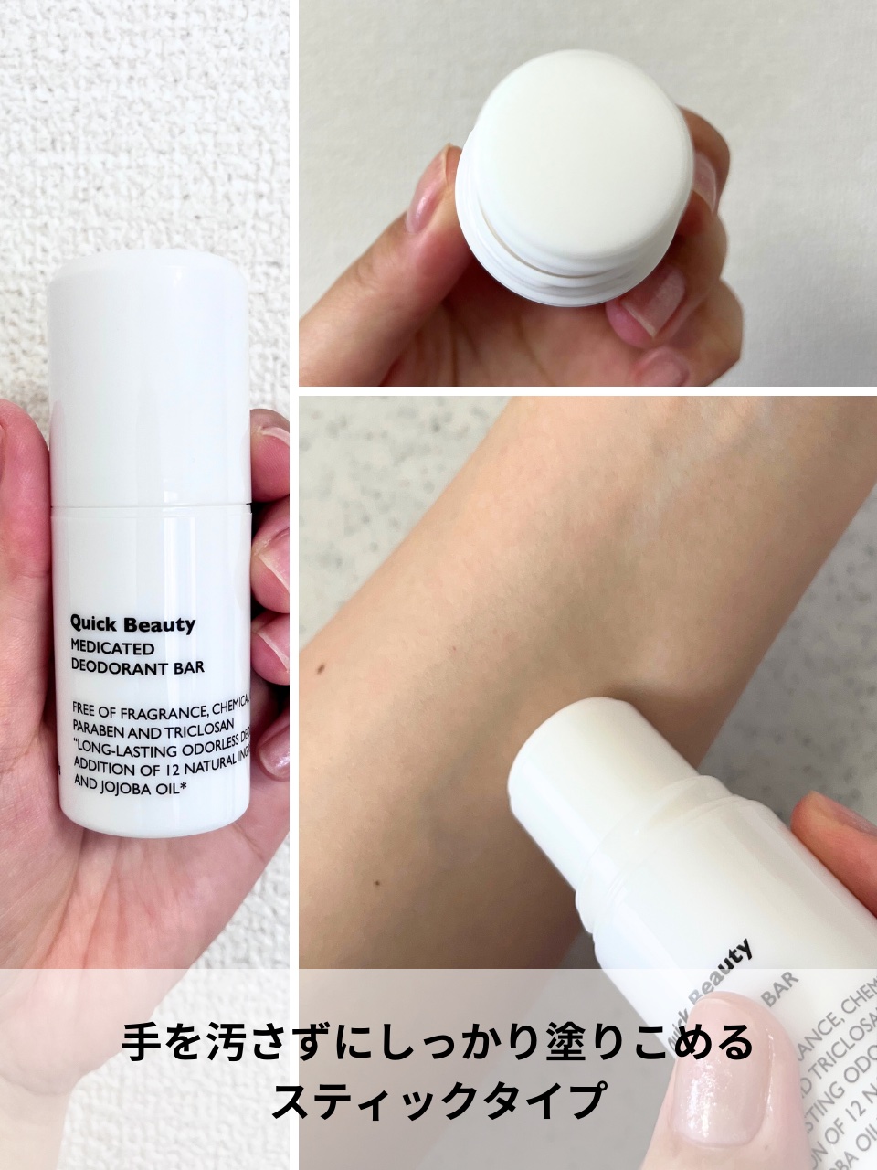 #PR#クイックビューティー@liberta_itemさまからいただきましたクイックビューティー薬用デオドラントバー表面サラサラ、ベタつき香り無くて◎夏本番はクセがないものが使いやすい🥹✨密着力が高く、汗・水・こすれ*に強く手を汚さず使えるス...