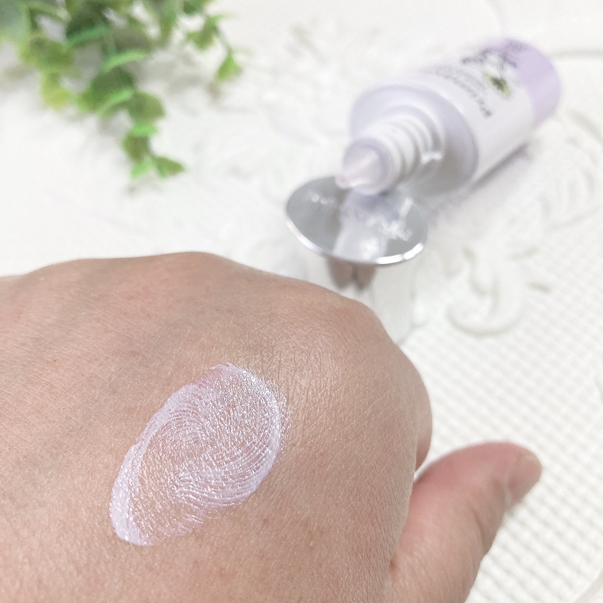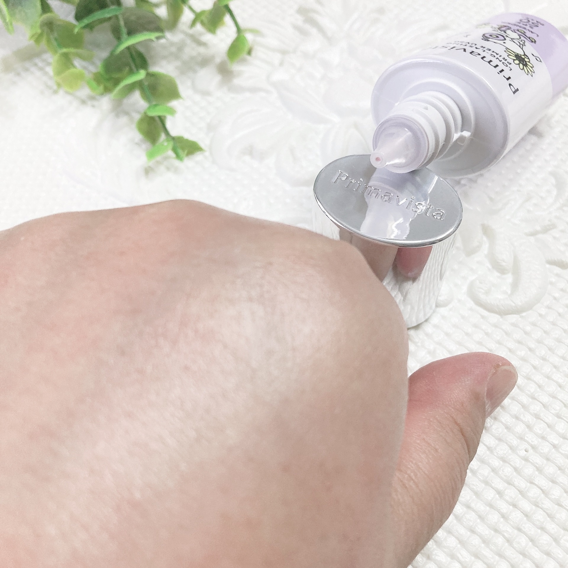 くすみを飛ばしてくれるラベンダー プリマヴィスタスキンプロテクトベース 皮脂くずれ防止 UV50 ほほのあたりにぬるとふっくらした印象に ほんのりなので使いやすくておすすめ