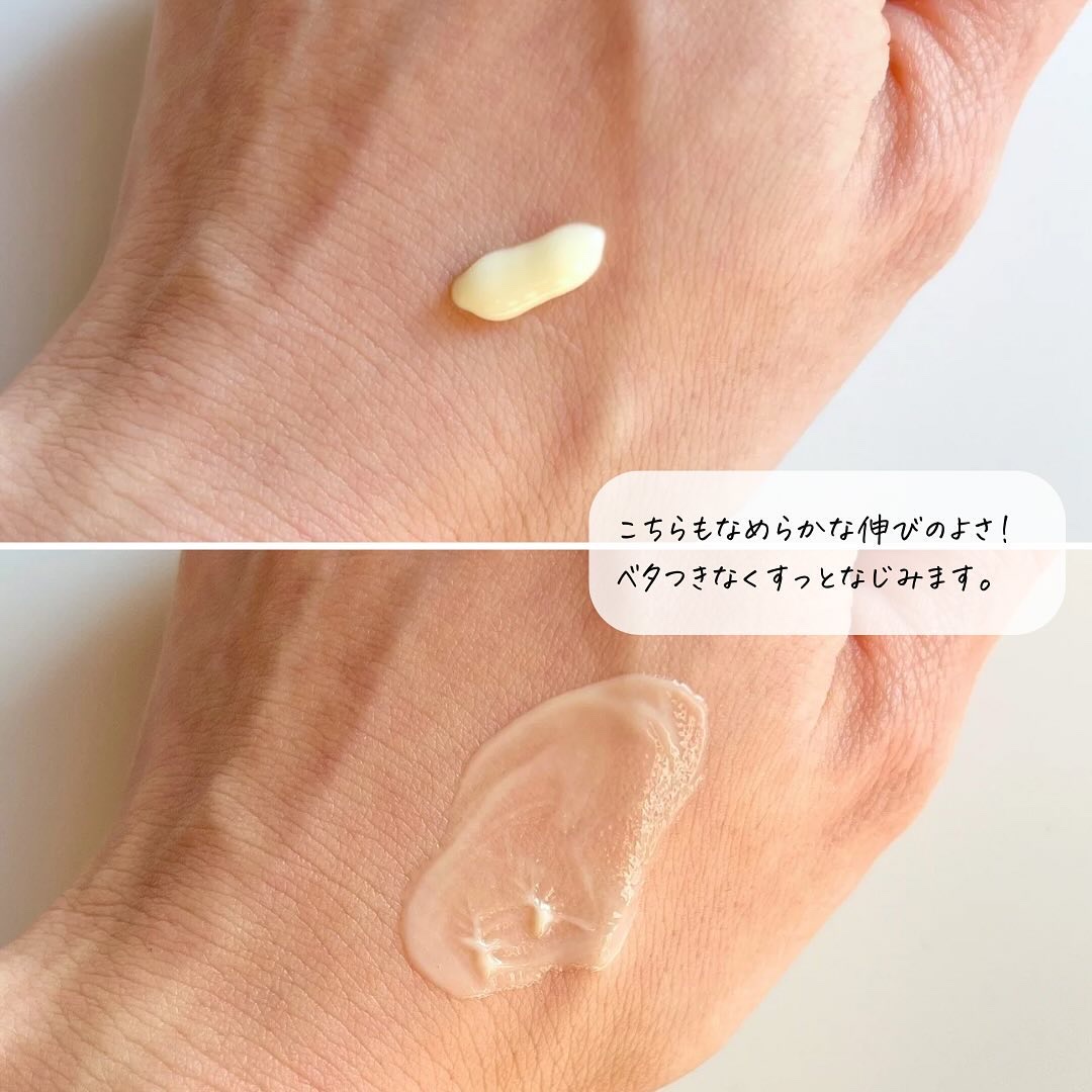 ベージュの方がなじみがよく、肌から浮く感じは皆無で自然にトーンアップできます。 すごく軽い使い心地ですが、なじみのいいカラーのおかげでより毛穴や色むらなどのアラをきれいにカバーできるように感じました。 ラベンダーは、肌の黄み感がかなり抑えられる印象! 透明感を求めるなら圧倒的にこちらで、色白に見えるように感じました。 黄みをカバーできるおかげで、苦手な青みピンクのリップやチークが似合う肌になれたので、ブルベメイクもしたいイエベさんにはラベンダーがおすすめです✨