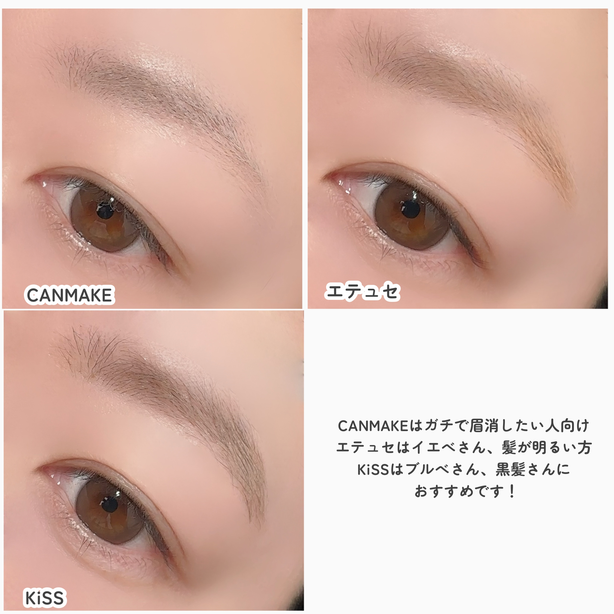 キャンメイクは黒の色素が薄くなってナチュラルな仕上がりに。すっぴんにも使えそう! KiSSはしっかり染まって眉の存在感が薄くなる!ダマになりにくい。 ぜひチェックしてみてください🙌🏻