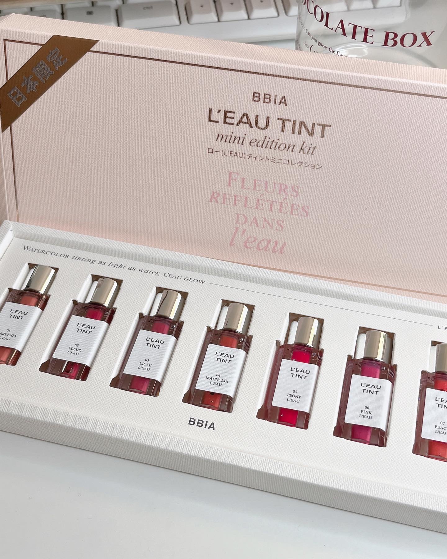 - - うるおいリップなのにしっかりカラーが定着し、時間が経っても塗りたてそのままのカラーを維持 *色が落ちにくいことから「飲み会リップ」としてSNSで話題に - 水のように軽くて快適なグロウティント、塗り重ねるほど鮮やかで透明に浮き上がる水彩画カラー - 香水瓶をイメージしたBBIA初のカスタムデザイン。パッケージはもちろん、カラーとテクスチャーに真心を込めて開発