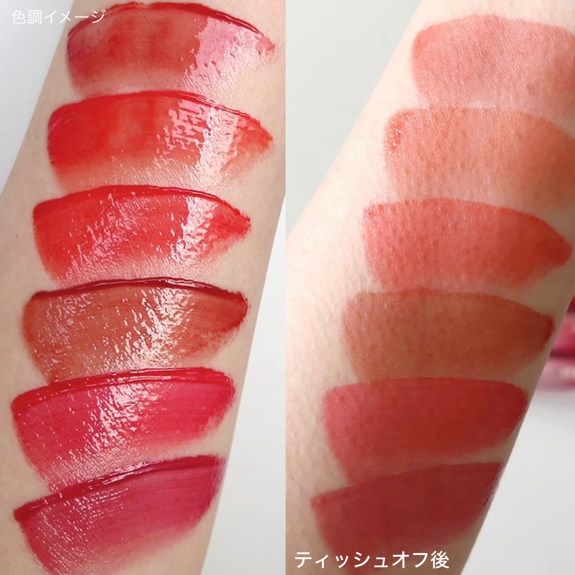 どれも優秀なティントですが、改めて色持ちを比較してみました✨ ティッシュオフや摩擦、クレンジングオイルでは3種にそこまで差はなかったのですが、最後お水で流したら違いがありました! 流した後に1番色残りしたのはkissのリップアーマーでした♡ とはいえ、どれもティントリップとして優秀なことは間違いなく✨ 結局どれもおすすめのお気に入りリップたちです☺️ 色味や質感はそれぞれ違うので、そういったお好みの部分に加えて、色持ちの具合が少しでも選ぶ際の参考になれば嬉しいです♡