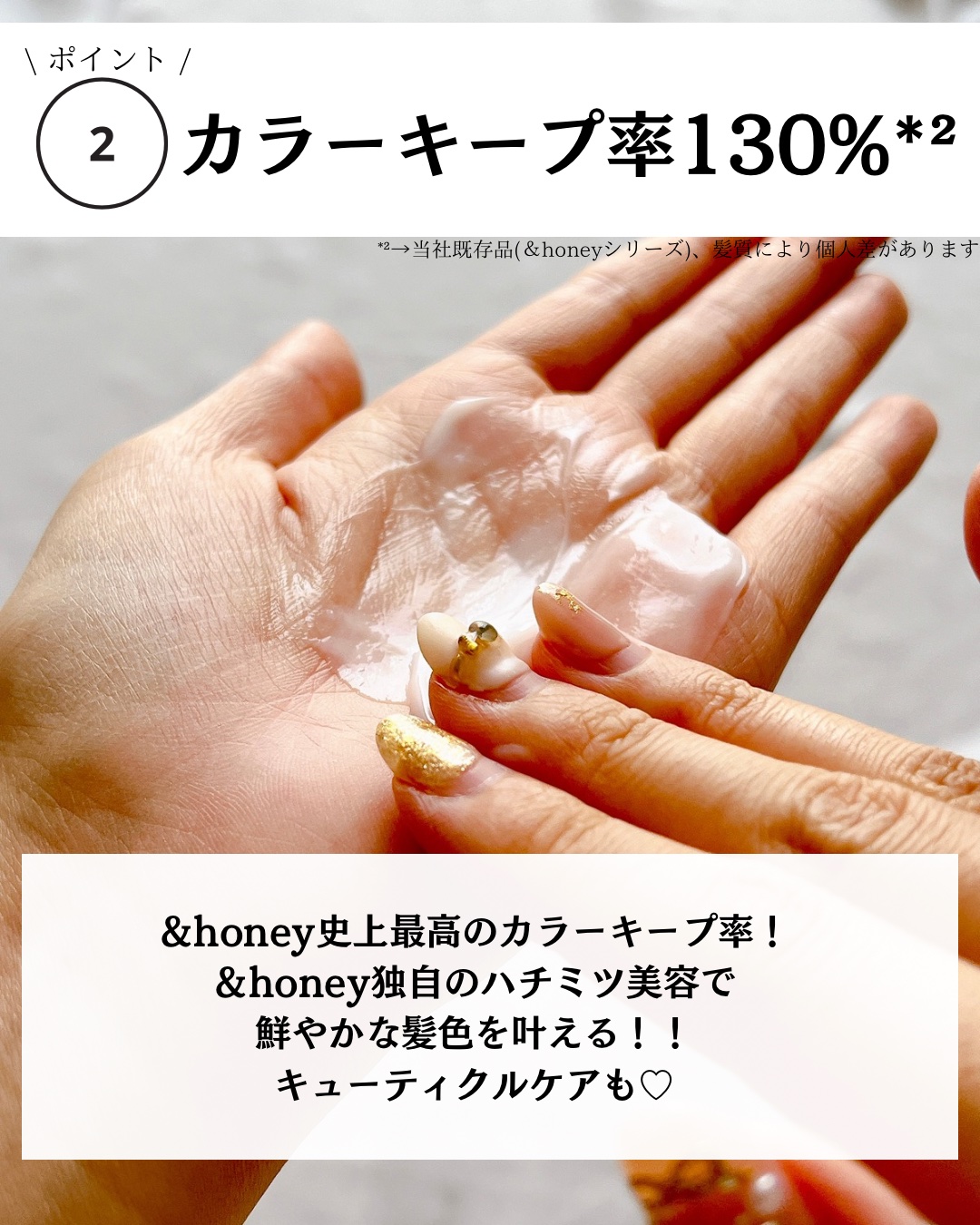 - 鮮やかな髪色をキープしながら、サラツヤの仕上がりへ導くハチミツ美容のカラーケアシャンプー。 製品の90%以上をハチミツ*1やレブリン酸*2などの保湿&保護+カラーケア成分で構成しました。※1 さらにハチミツ美容とカラーケア成分*2*3*4の融合により、鮮やかな髪色をキープしながらキューティクルケアを叶えます。 &honey独自のカラーコントロール処方で、カラーキープ率130%の髪へ※2。 ケラチン由来の洗浄成分*5の配合により、染めたての髪色をキープしながらツヤめく洗い上がりです。 無添加フリー処方です。※3。 フランス産スズランエキス*6を使用した、ミュゲハニーの香りです。 サラツヤタイプ ※1 基剤を除く、水を含む ※2 当社既存品比(&honeyシリーズ比)、髪質などにより個人差があります ※3 サルフェート、パラベン、PG、鉱物油、動物実験 *1 保湿 *2 レブリン酸(pH調整剤・補修) *3 加水分解ハチミツタンパク(保護) *4 ケラチン(羊毛)(補修・化学修飾していない) *5 ココイル加水分解ケラチンK(羊毛) *6 スズランエキス(香気・保湿)