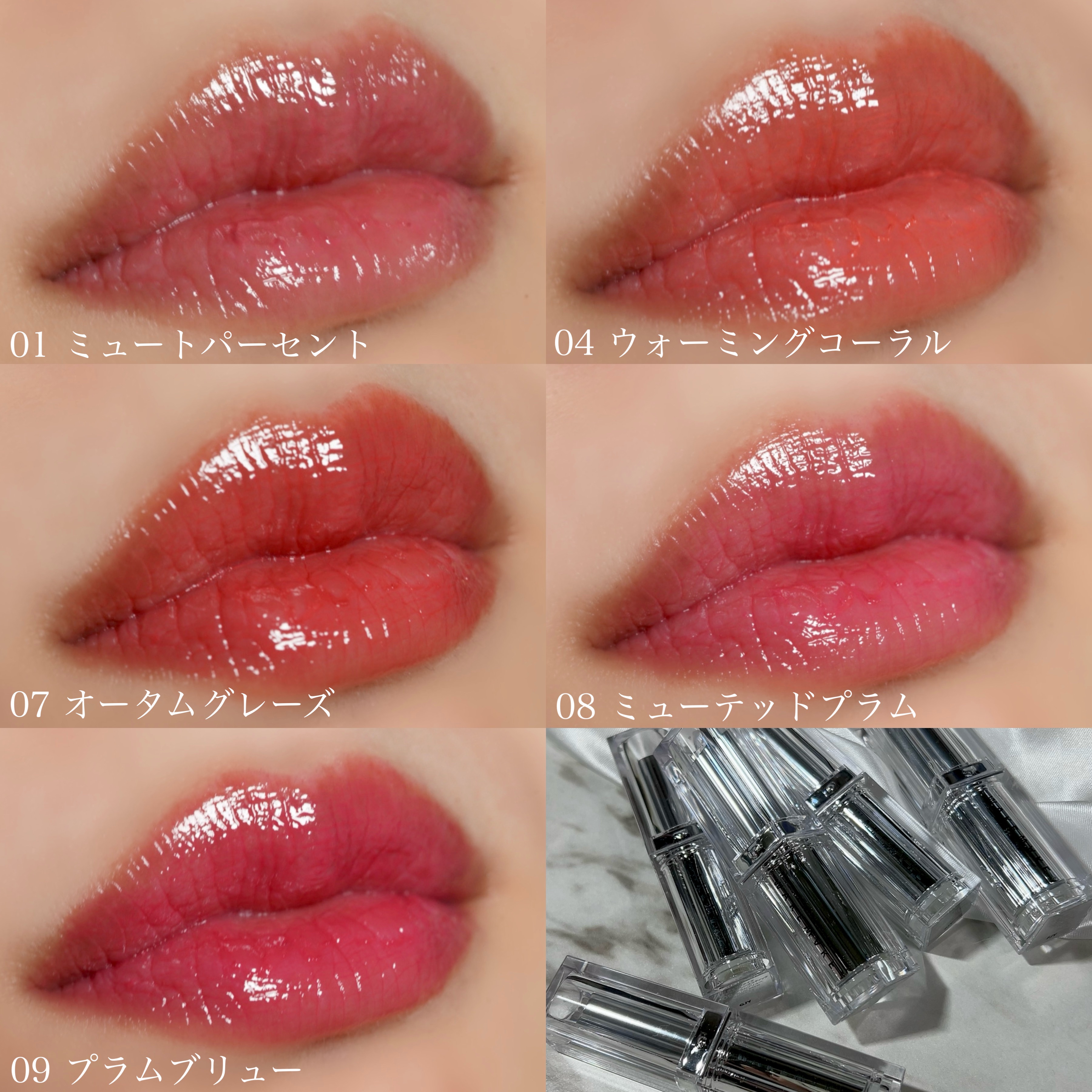 - <01 ミュートパーセント> リンゴ酸ジイソステアリル、ダイマージリノール酸ダイマージリノレイルビス(ベヘニル/イソステアリル/フィトステリル)、ビスジグリセリルポリアシルアジペート 2、デカイソステアリン酸ポリグリセリル 10、トリイソステアリン酸ポリグリセリル 2、水添ポリイソブテン、ジイソステアリン酸ポリグリセリル 3、トリメリト酸トリトリデシル、ダイマージリノール酸ジオクチルドデシル、パラフィン、マイクロクリスタリンワックス、(セバシン酸/イソパルミチン酸)ジグリセリル、酸化チタン、オクチルドデカノール、合成ワックス、黄5、プロパンジオール、赤227、(エチレン/プロピレン)コポリマー、ジステアルジモニウムヘクトライト、香料、酸化鉄、赤202、ジイソステアリン酸ポリグリセリル 2、青1、炭酸プロピレン、水、トコフェロール、BG、1,2 ヘキサンジオール、ココヤシ果実エキス、スイカ果実エキス、グレープフルーツ果実エキス、モモ果実エキス、ザクロ果実エキス、リンゴ果実エキス、エチルヘキシルグリセリン <04 ウォーミングコーラル> ダイマージリノール酸ダイマージリノレイルビス(ベヘニル/イソステアリル/フィトステリル)、リンゴ酸ジイソステアリル、ビスジグリセリルポリアシルアジペート 2、デカイソステアリン酸ポリグリセリル 10、トリイソステアリン酸ポリグリセリル 2、水添ポリイソブテン、ジイソステアリン酸ポリグリセリル 3、トリメリト酸トリトリデシル、ダイマージリノール酸ジオクチルドデシル、パラフィン、マイクロクリスタリンワックス、(セバシン酸/イソパルミチン酸)ジグリセリル、オクチルドデカノール、酸化チタン、合成ワックス、赤104(1)、酸化鉄、黄5、プロパンジオール、黄4、(エチレン/プロピレン)コポリマー、ジステアルジモニウムヘクトライト、香料、ジイソステアリン酸ポリグリセリル 2、炭酸プロピレン、水、トコフェロール、BG、1,2 ヘキサンジオール、ココヤシ果実エキス、スイカ果実エキス、グレープフルーツ果実エキス、モモ果実エキス、ザクロ果実エキス、リンゴ果実エキス、エチルヘキシルグリセリン <07 オータムグレーズ> ダイマージリノール酸ダイマージリノレイルビス(ベヘニル/イソステアリル/フィトステリル)、リンゴ酸ジイソステアリル、ビスジグリセリルポリアシルアジペート-2、デカイソステアリン酸ポリグリセリル-10、トリイソステアリン酸ポリグリセリル-2、水添ポリイソブテン、ジイソステアリン酸ポリグリセリル-3、トリメリト酸トリトリデシル、ダイマージリノール酸ジオクチルドデシル、パラフィン、マイクロクリスタリンワックス、(セバシン酸/イソパルミチン酸)ジグリセリル、オクチルドデカノール、酸化チタン、酸化鉄、合成ワックス、黄5、プロパンジオール、赤202、(エチレン/プロピレン)コポリマー、ジイソステアリン酸ポリグリセリル-2、ジステアルジモニウムヘクトライト、香料、青1、赤227、炭酸プロピレン、水、トコフェロール、BG、1、2-ヘキサンジオール、ココヤシ果実エキス、スイカ果実エキス、グレープフルーツ果実エキス、モモ果実エキス、ザクロ果実エキス、リンゴ果実エキス、エチルヘキシルグリセリン <08 ミューテッドプラム> ダイマージリノール酸ダイマージリノレイルビス(ベヘニル/イソステアリル/フィトステリル)、リンゴ酸ジイソステアリル、ビスジグリセリルポリアシルアジペート 2、デカイソステアリン酸ポリグリセリル 10、トリイソステアリン酸ポリグリセリル 2、水添ポリイソブテン、ジイソステアリン酸ポリグリセリル 3、トリメリト酸トリトリデシル、ダイマージリノール酸ジオクチルドデシル、パラフィン、マイクロクリスタリンワックス、(セバシン酸/イソパルミチン酸)ジグリセリル、オクチルドデカノール、酸化チタン、合成ワックス、酸化鉄、黄5、プロパンジオール、赤202、(エチレン/プロピレン)コポリマー、赤227、ジイソステアリン酸ポリグリセリル 2、ジステアルジモニウムヘクトライト、香料、赤104(1)、青1、炭酸プロピレン、水、トコフェロール、BG、1,2 ヘキサンジオール、ココヤシ果実エキス、スイカ果実エキス、グレープフルーツ果実エキス、モモ果実エキス、ザクロ果実エキス、リンゴ果実エキス、エチルヘキシルグリセリン <09 プラムブリュー> ダイマージリノール酸ダイマージリノレイルビス(ベヘニル/イソステアリル/フィトステリル)、リンゴ酸ジイソステアリル、ビスジグリセリルポリアシルアジペート 2、デカイソステアリン酸ポリグリセリル 10、トリイソステアリン酸ポリグリセリル 2、水添ポリイソブテン、ジイソステアリン酸ポリグリセリル 3、トリメリト酸トリトリデシル、ダイマージリノール酸ジオクチルドデシル、パラフィン、マイクロクリスタリンワックス、(セバシン酸/イソパルミチン酸)ジグリセリル、オクチルドデカノール、酸化チタン、合成ワックス、赤202、プロパンジオール、酸化鉄、黄5、赤227、(エチレン/プ