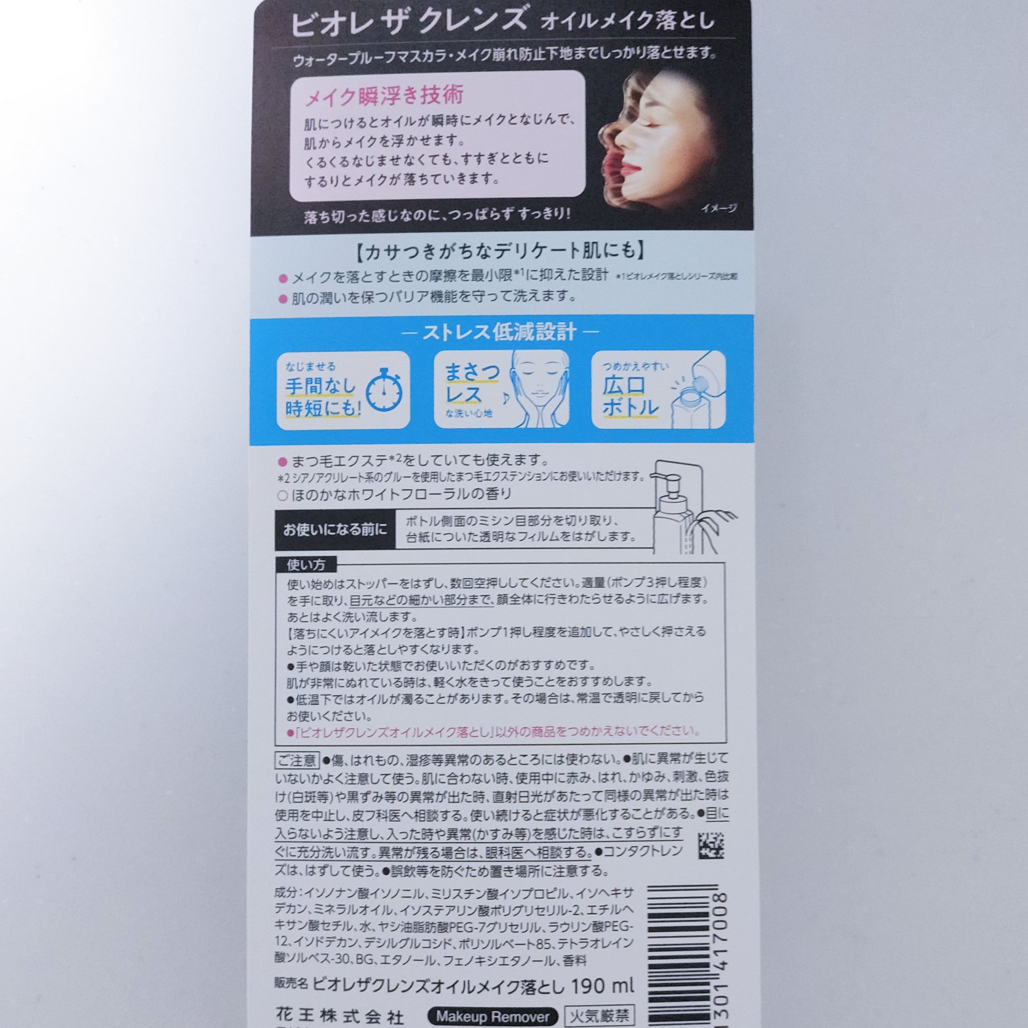 - つけるだけメイク瞬浮き、くるくるなじませずに落ちる! ウォータープルーフマスカラ・毛穴のメイクまでしっかりオフするのに、肌つっぱりにくい。 【カサつきがちなデリケート肌にも使える】 ・肌になじませるときの摩擦を最小限*1に抑えた設計 ・肌の潤いを保つバリア機能を守って洗えます。 【ストレス低減設計】 ・なじませる手間なしで時短になる ・まさつレスな洗い心地 ・つめかえやすい広口ボトル ●まつ毛エクステをしていても使えます。*2 ●ほのかなホワイトフローラルの香り *1ビオレメイク落としシリーズ内比較 *2シアノアクリレート系のグルーを使用したまつ毛エクステンションにお使いいただけます。