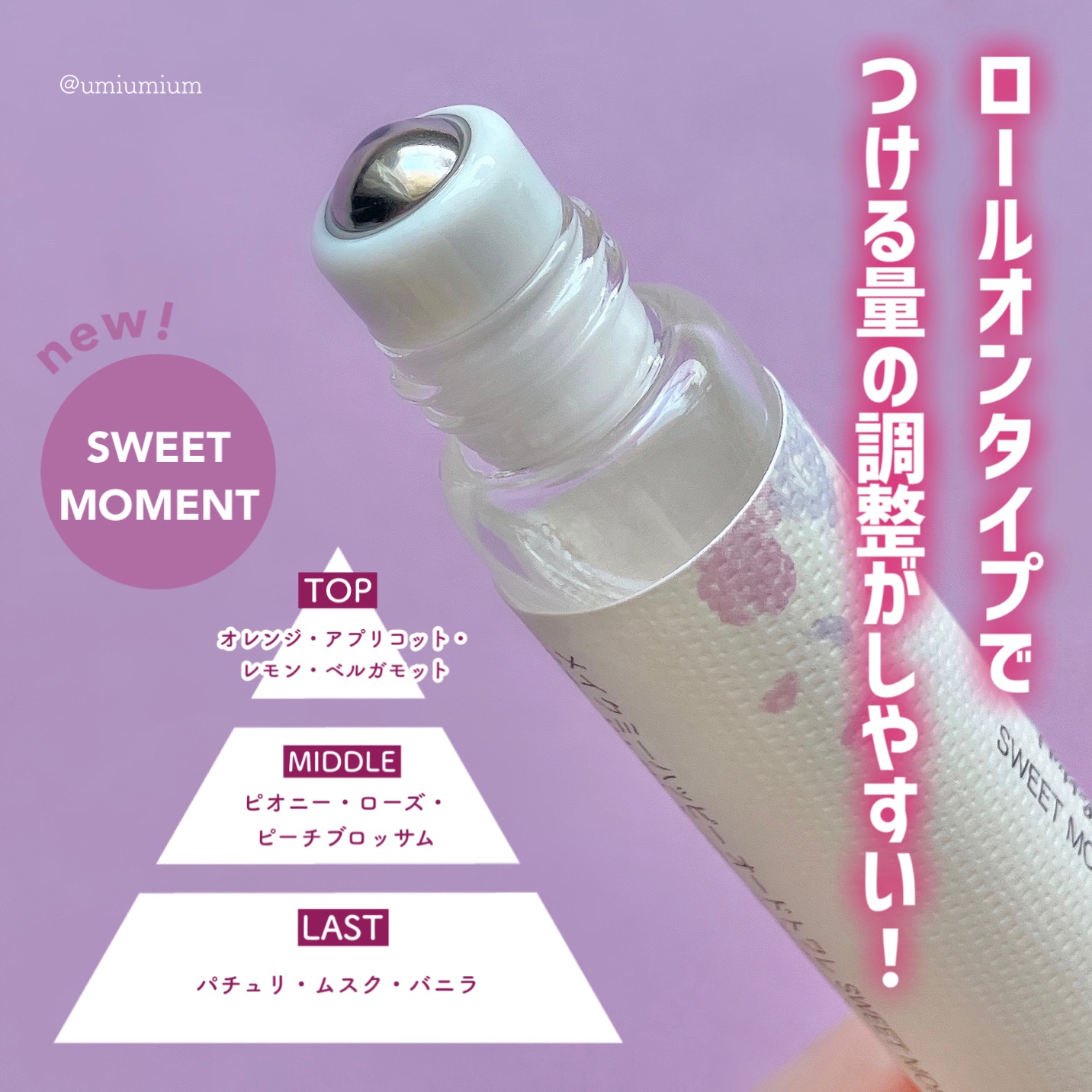 - つける量を調整しやすいロールオンタイプのオードトワレ。 持ち運びにも便利なサイズです。 サトウキビ由来の植物性アルコールを使用。 SWEET MOMENT:多幸感溢れるフローラルブーケの香り TOP:オレンジ、アプリコット、レモン、ベルガモット MIDDLE:ピオニー、ローズ、ピーチブロッサム LAST:パチュリ、ムスク、バニラ